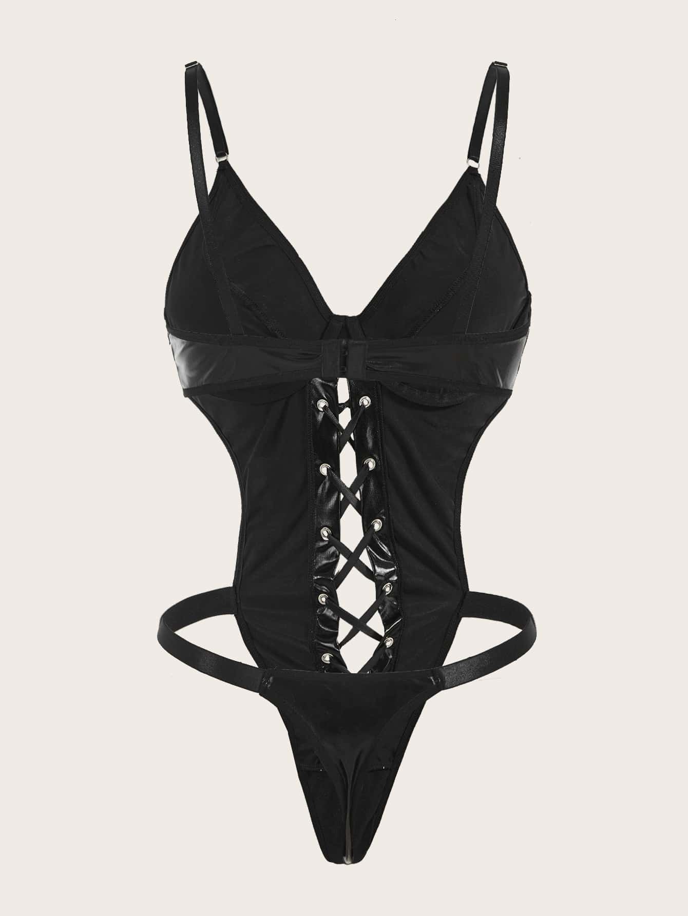 Grunge Punk Lace Up Front PU Teddy Bodysuit Lingerie