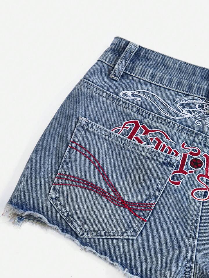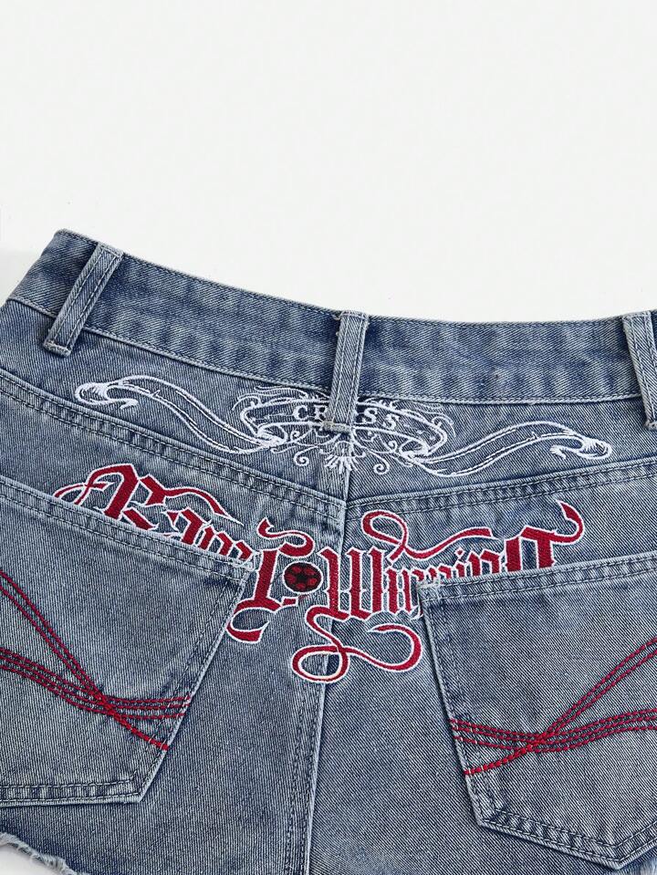 Grunge Punk Ladies Casual Commute Embroidered Slogan, Football, Race Car Motif Denim Shorts