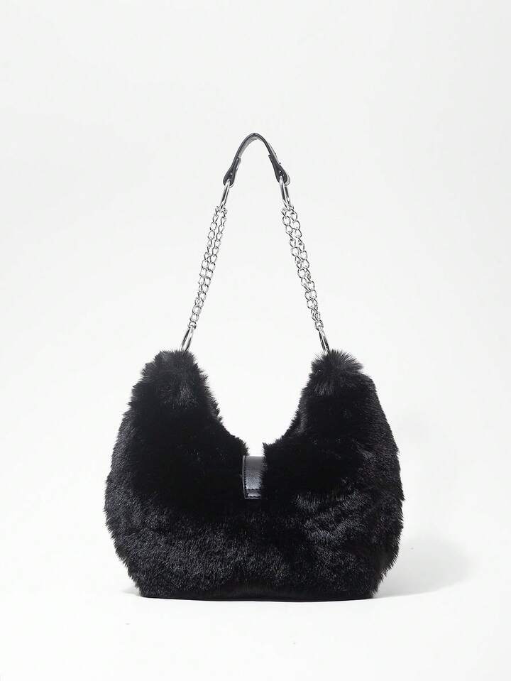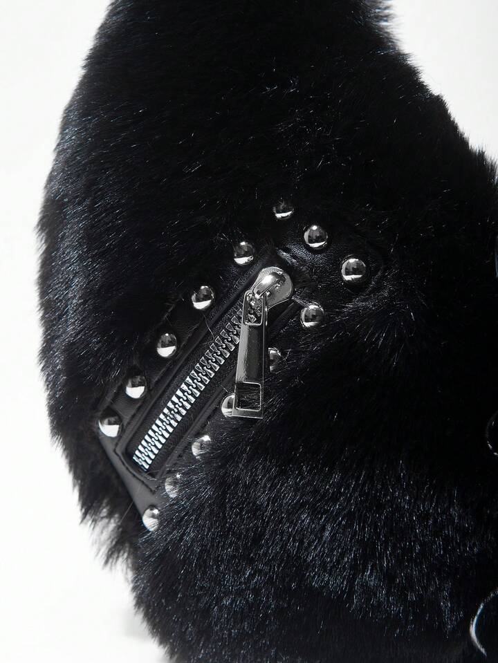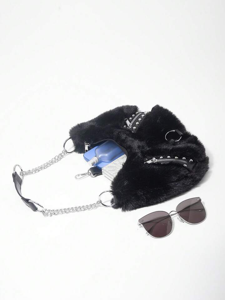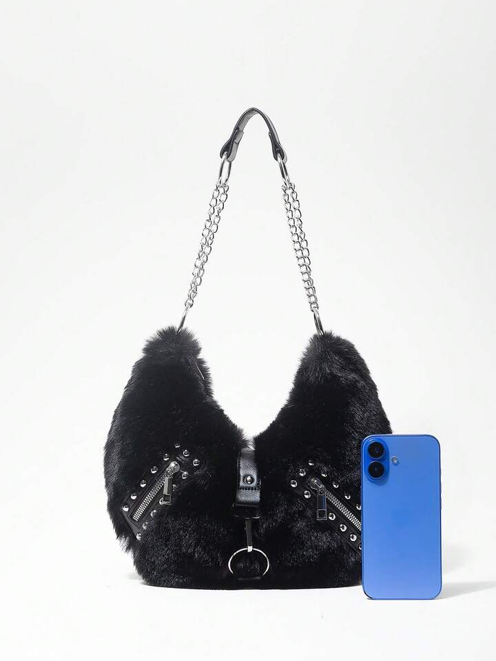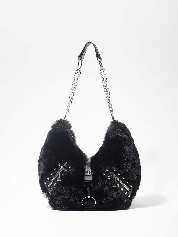 Grunge Punk Ladies, Women Shoulder Bag,Hobo Bag,Faux Fur,Fuzz,Plush Bag,Rivet,Fashionable,Personalized,Versatile,Street,Sweet And Cool Girls,Hot Girls,Punk,Y2k,Daily,Autumn And Winter(Random Pattern)