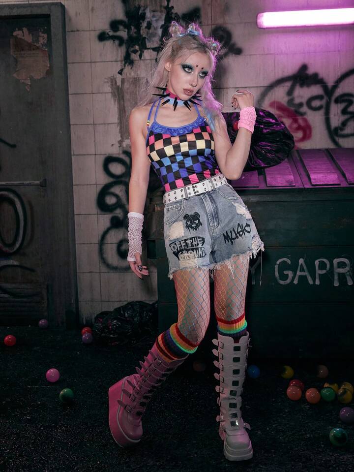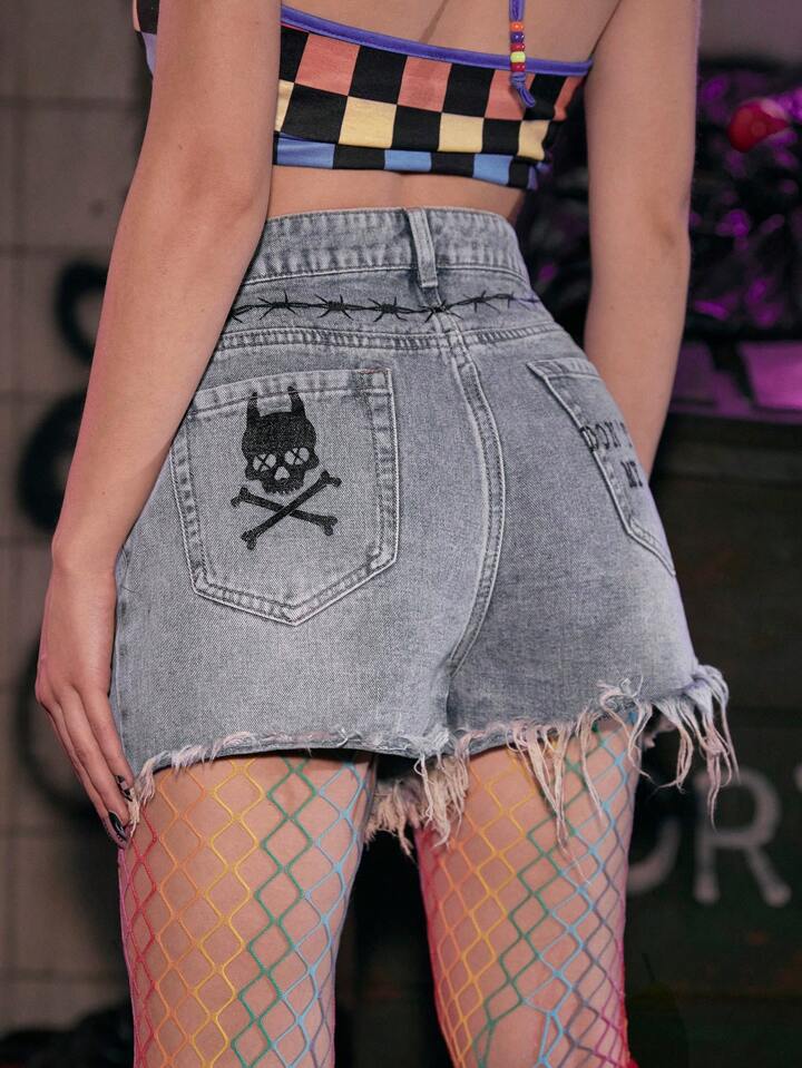 Grunge Punk Letter Graphic Ripped Raw Hem Denim Shorts