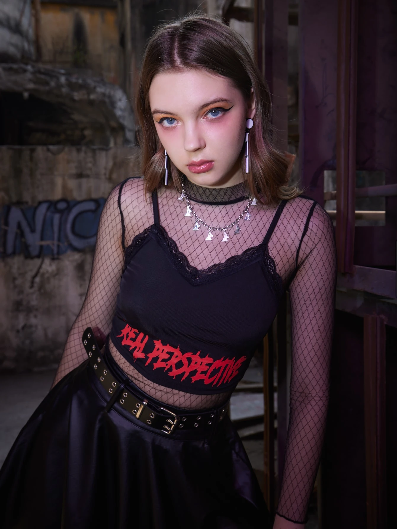 Grunge Punk Letter Lace Trim Crop Cami Without Fishnet Top