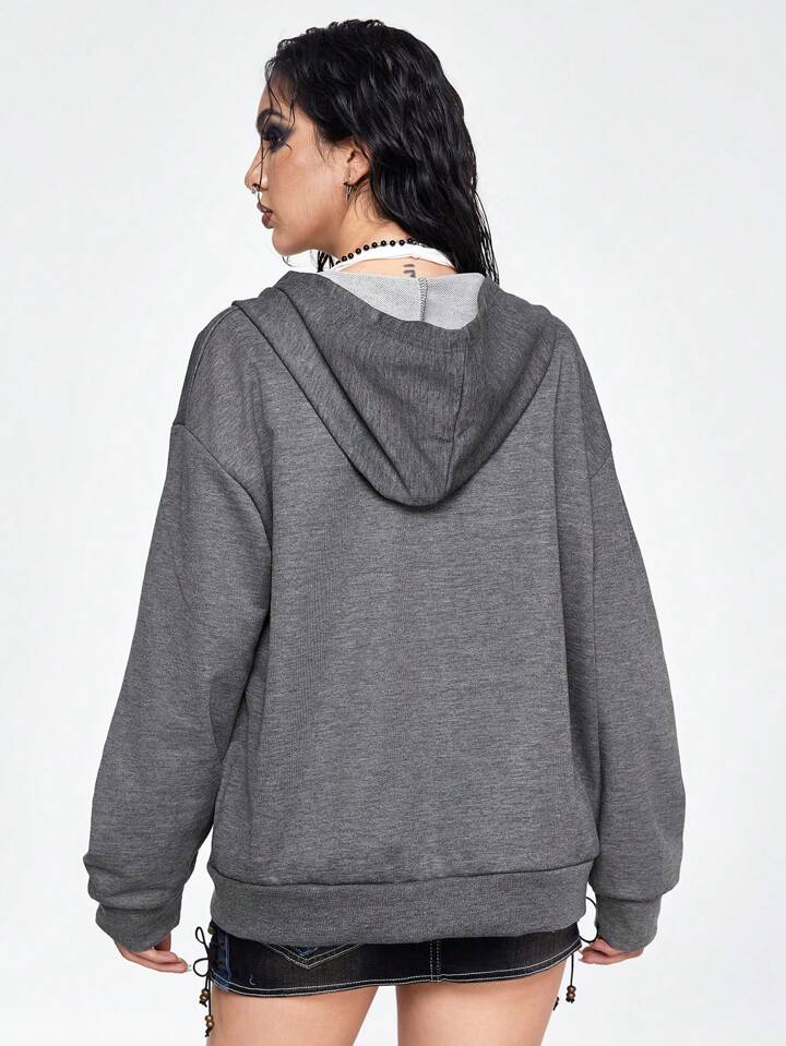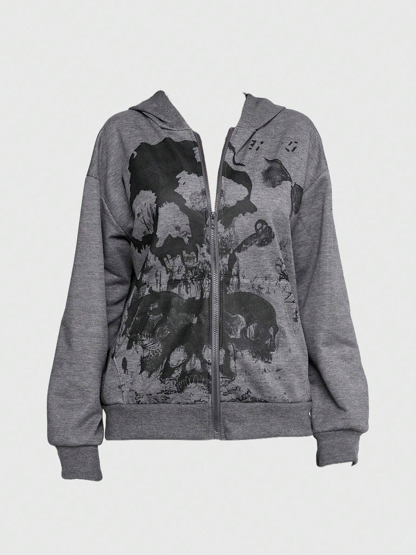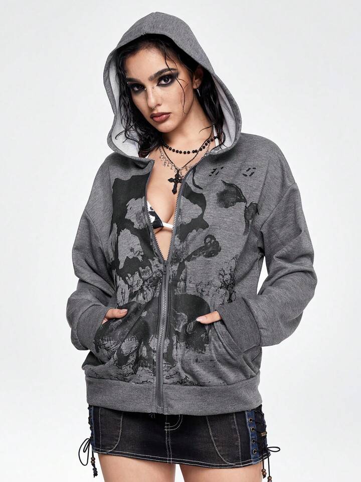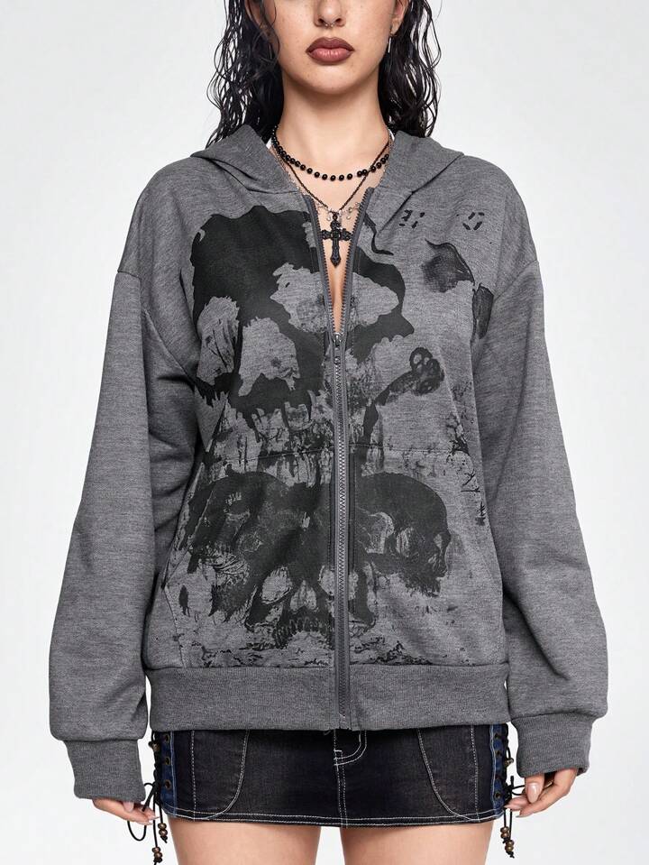 Grunge Punk Long Zip-Up Hoodie With Vintage Skeleton Print, For Streetwear Fashionistas