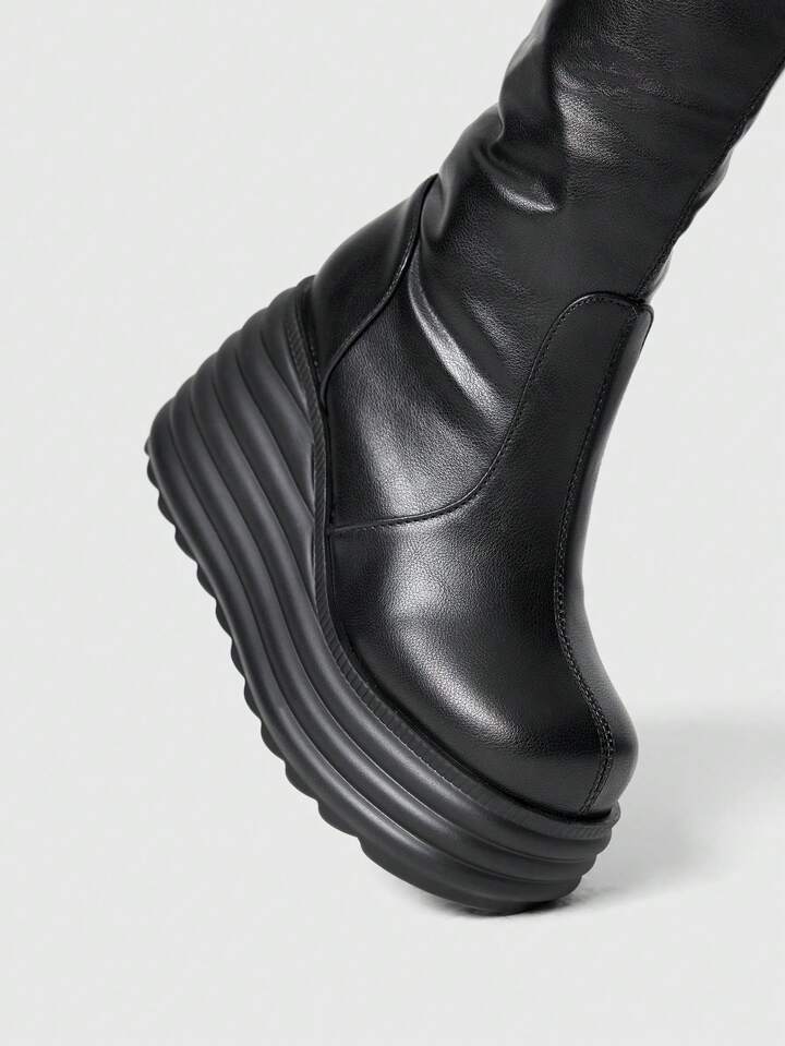 Grunge Punk Matte Round Toe Wedge Heel Thick Sole PU Black Mid-Calf Boots, Suitable For Daily, Rock, Punk, Street, Campus Wear