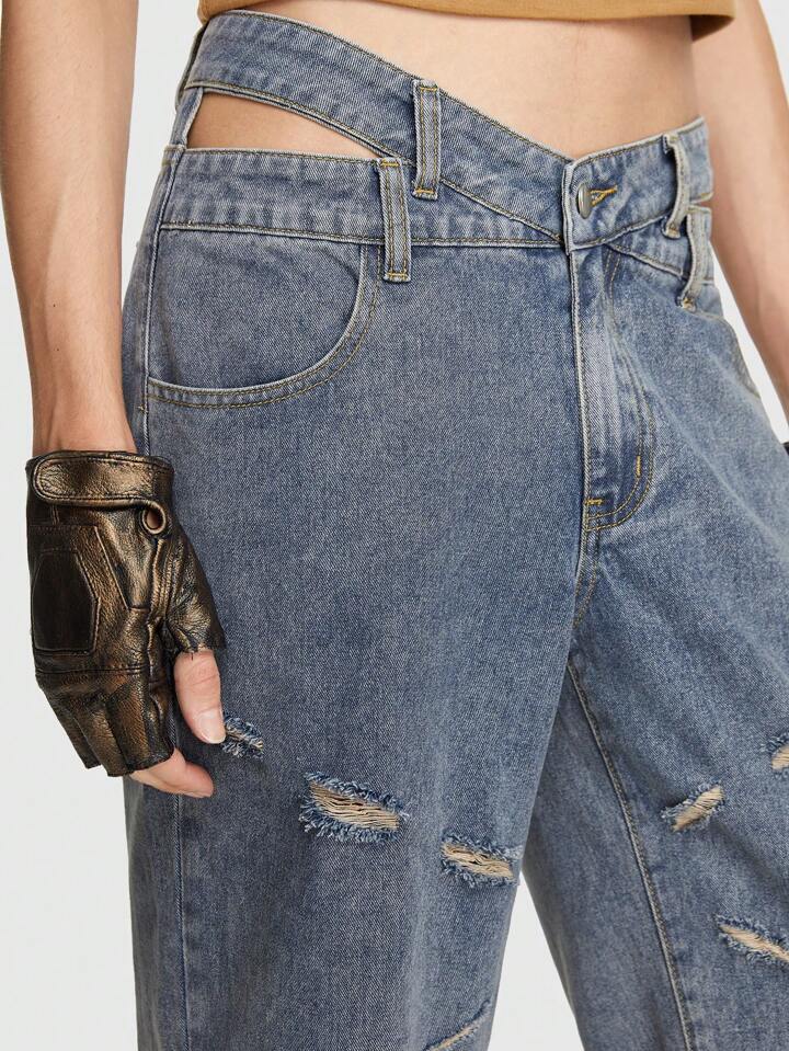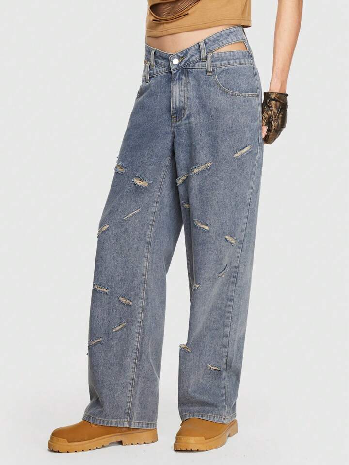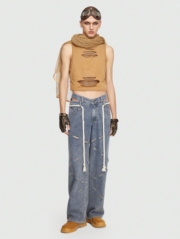 Grunge Punk Men Brushed Hollow Out Waist Straight Leg Jeans