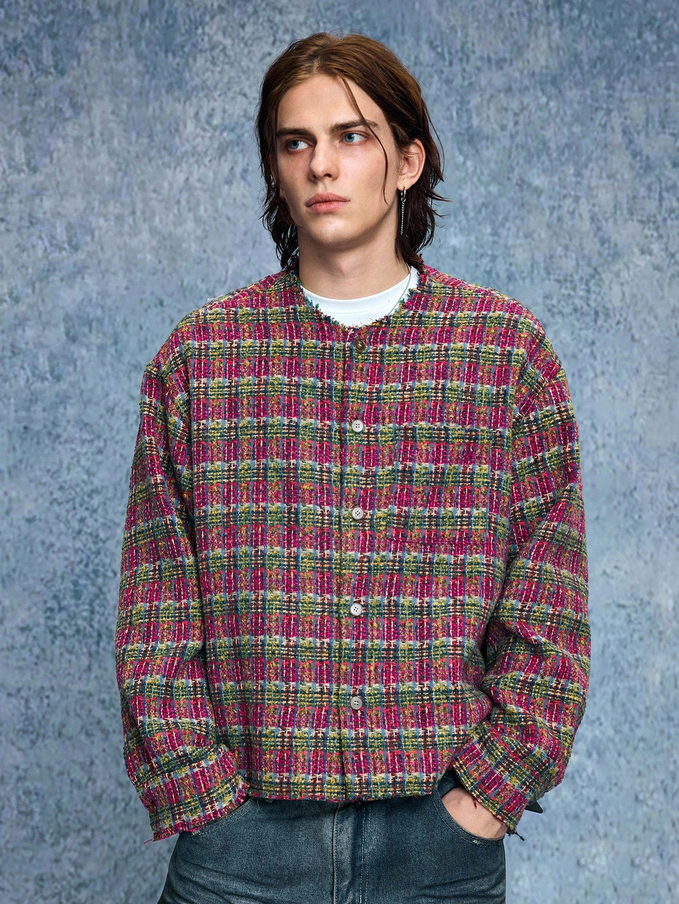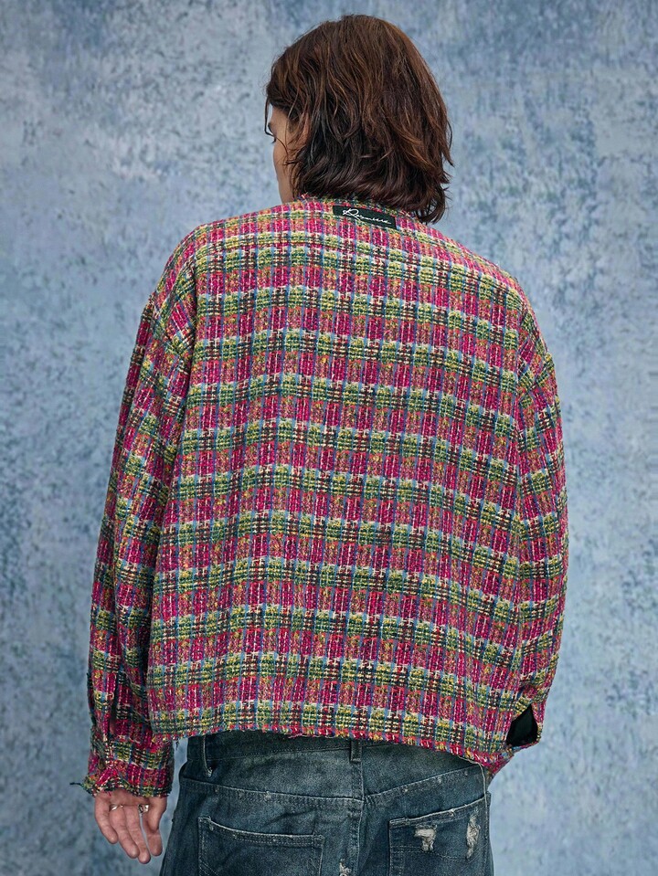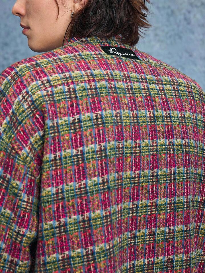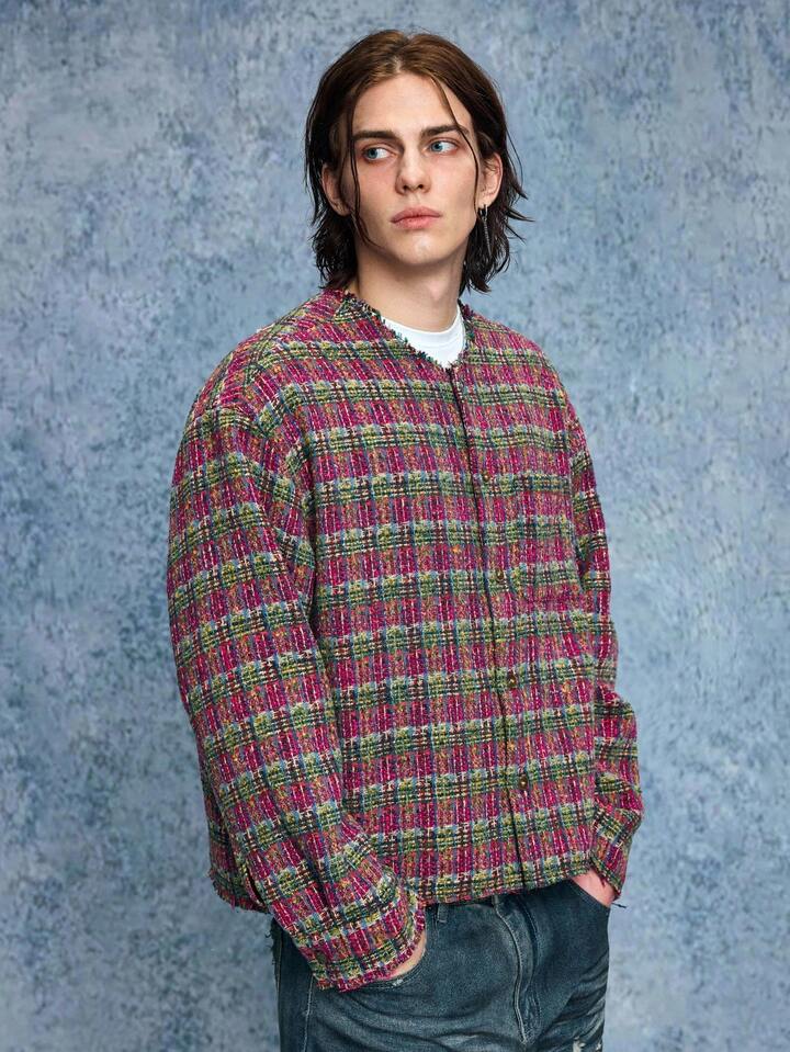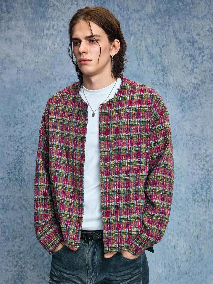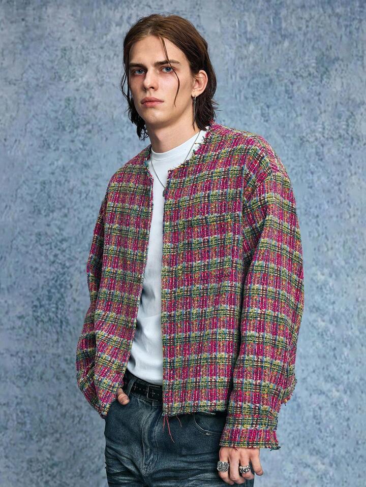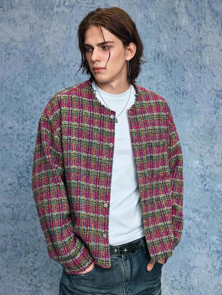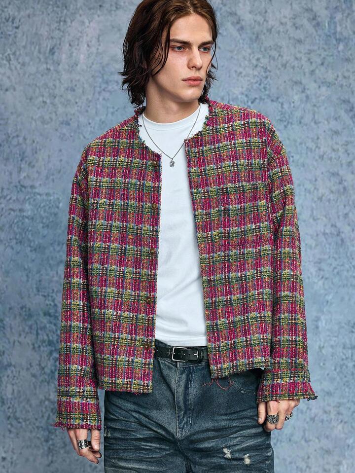 Grunge Punk Men's Casual Fashionable Street Plaid Pattern Collarless Tweed Jacket, Autumn