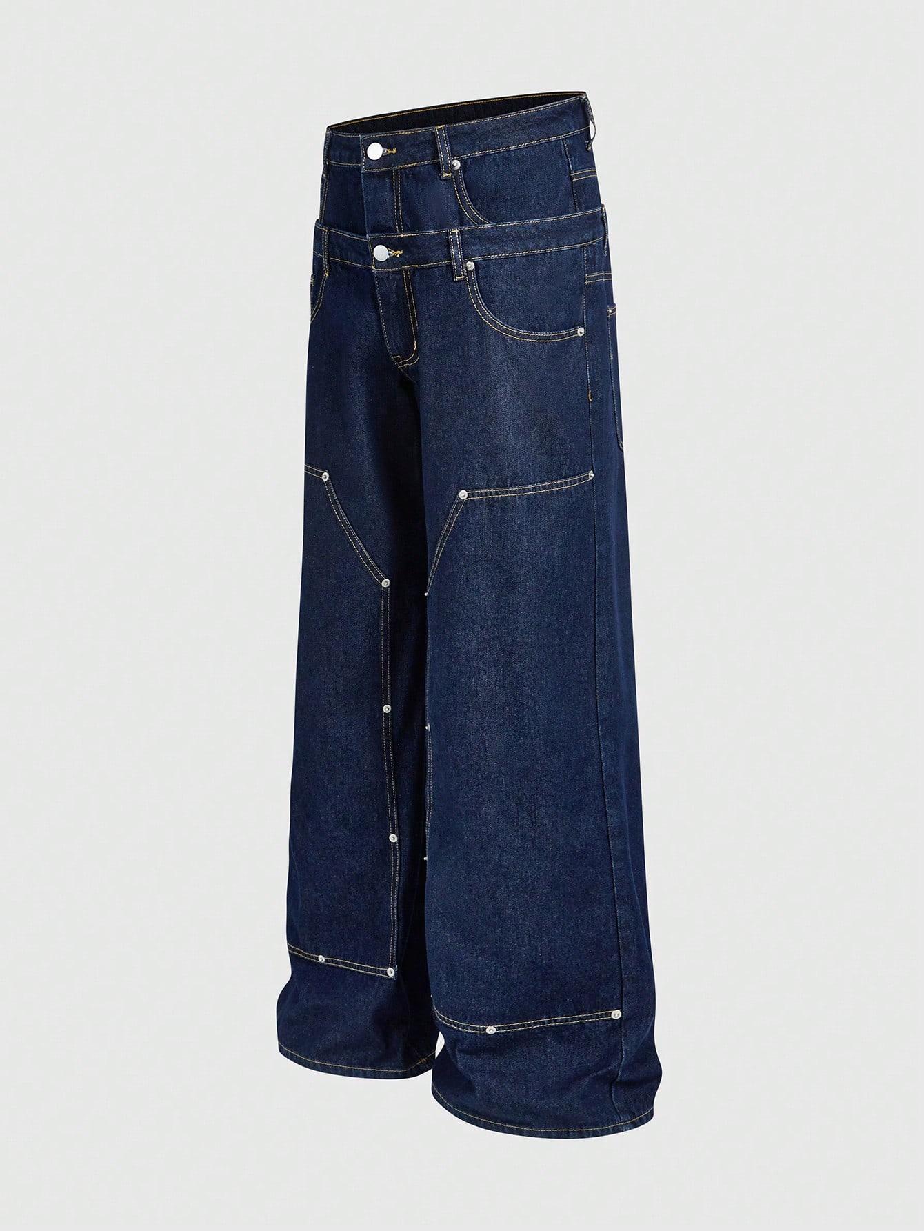 Grunge Punk Men's Loose Fit Wide Leg Double-Layer Waistband Casual Jeans