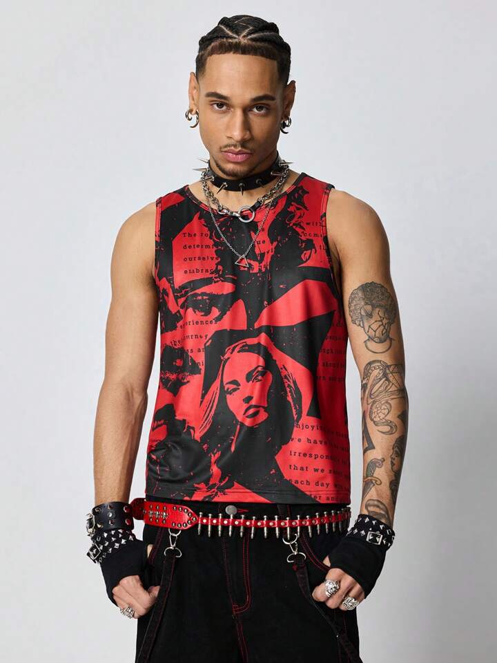 Grunge Punk Men's Punk Slogan & Figure Print Round Neck Casual Tank Top