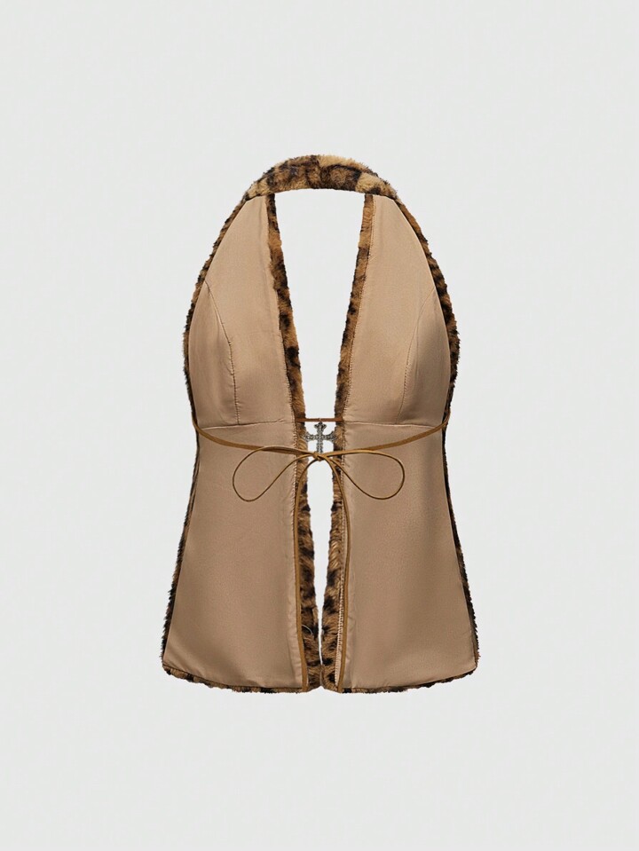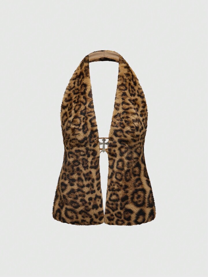 Grunge Punk Millennium Y2K Halter Sexy Vintage Leopard Fur Cross Pendant Women Camisole