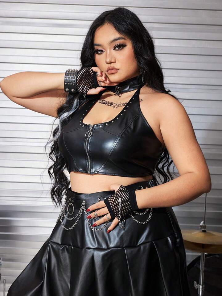 Grunge Punk Music Festival Punk Rivet Zip-Up Backless Sexy Black PU Plus Size Camisole & Tank Tops