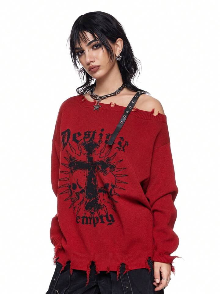 Grunge Punk New Year Holiday Asymmetrical Neck Cross Skull Music Festival Red Long Sleeve Raglan PU Sweater For Women