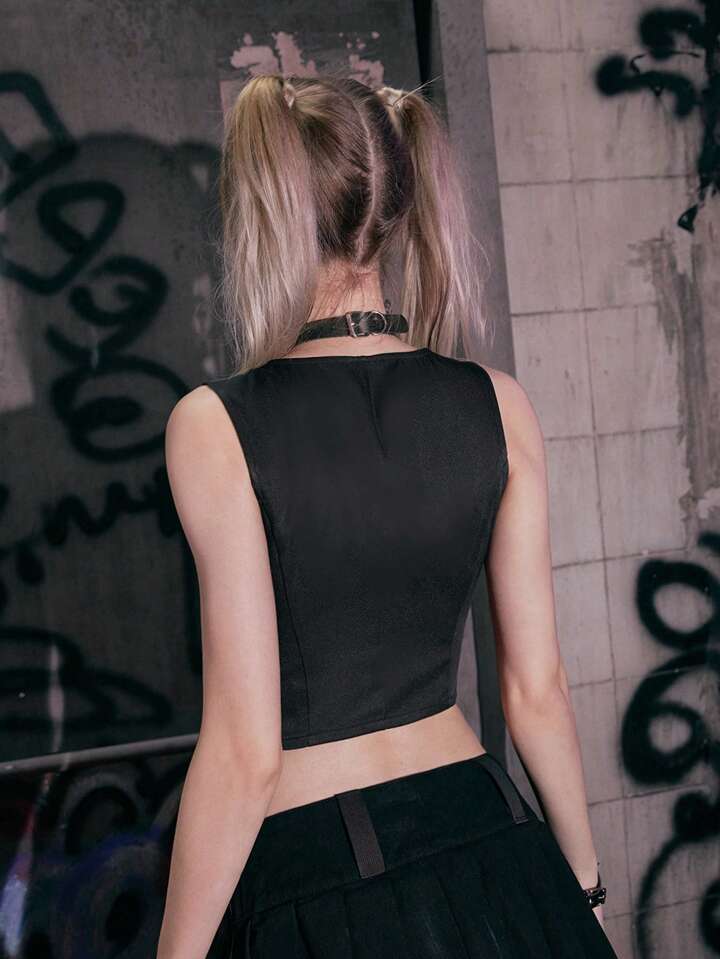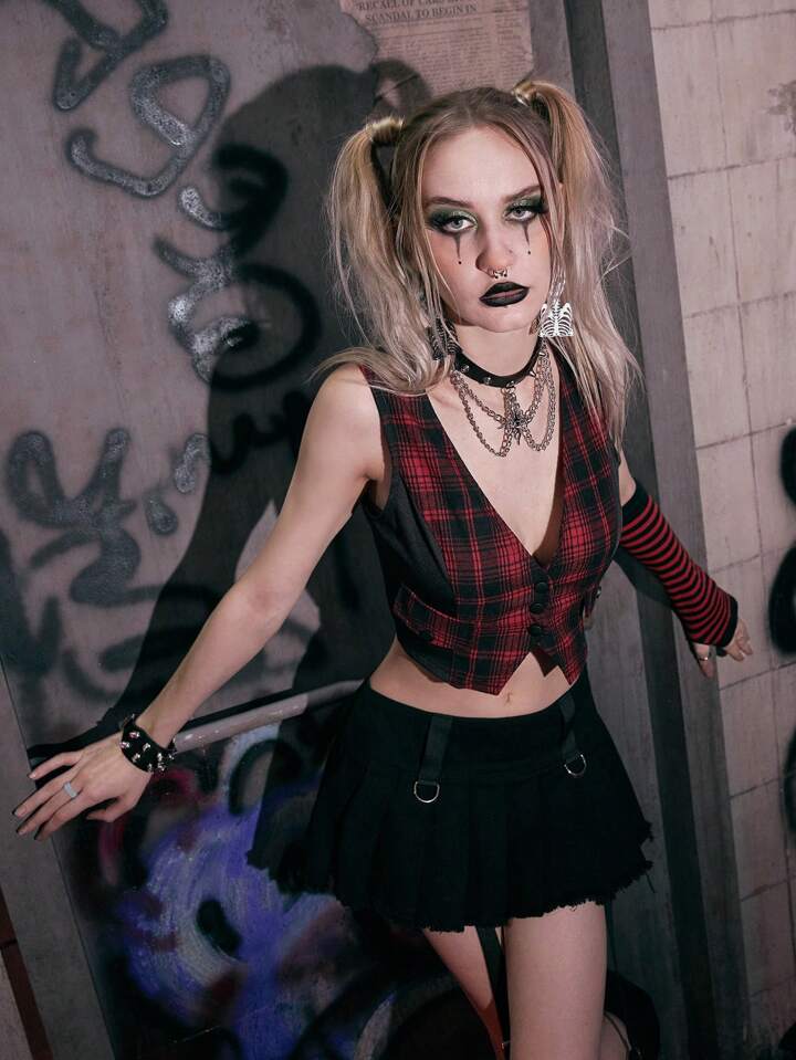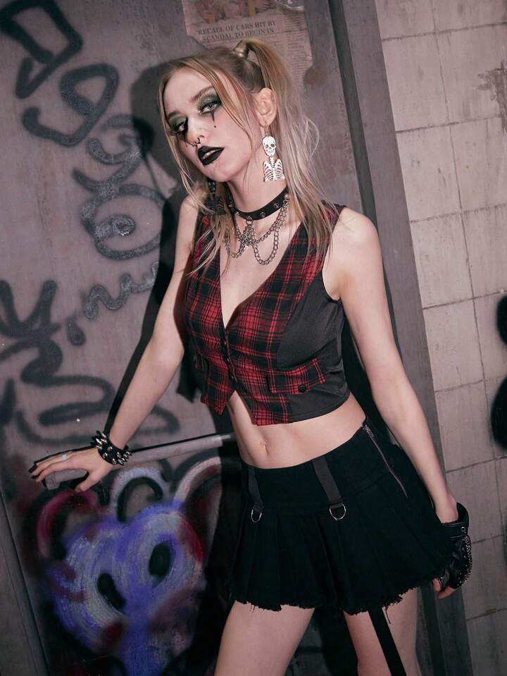 Grunge Punk Plaid Print Button Front Vest Blazer