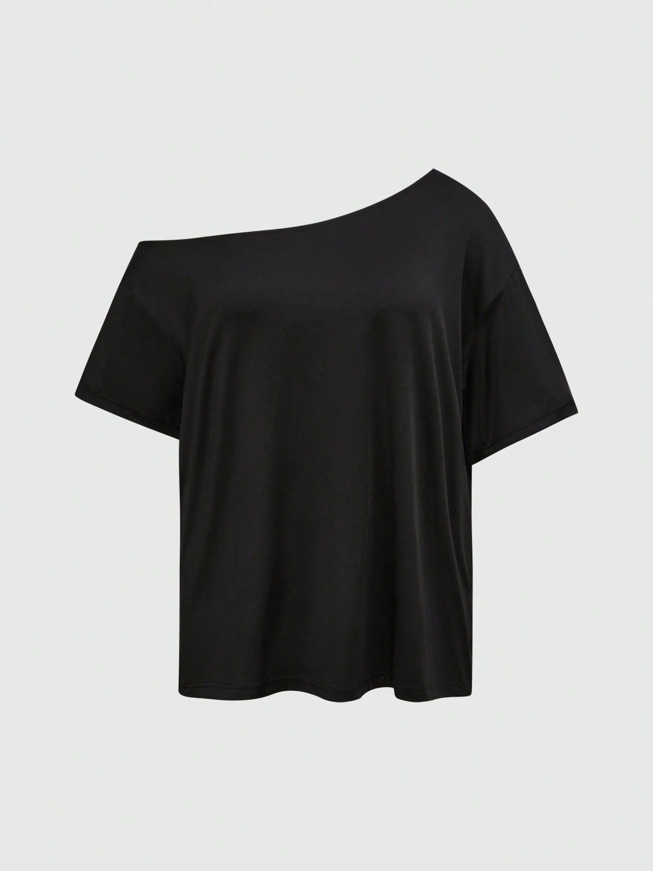 Grunge Punk Plus Size Black Plain Asymmetrical Shoulder T-Shirt Top, Punk Street Sexy Style