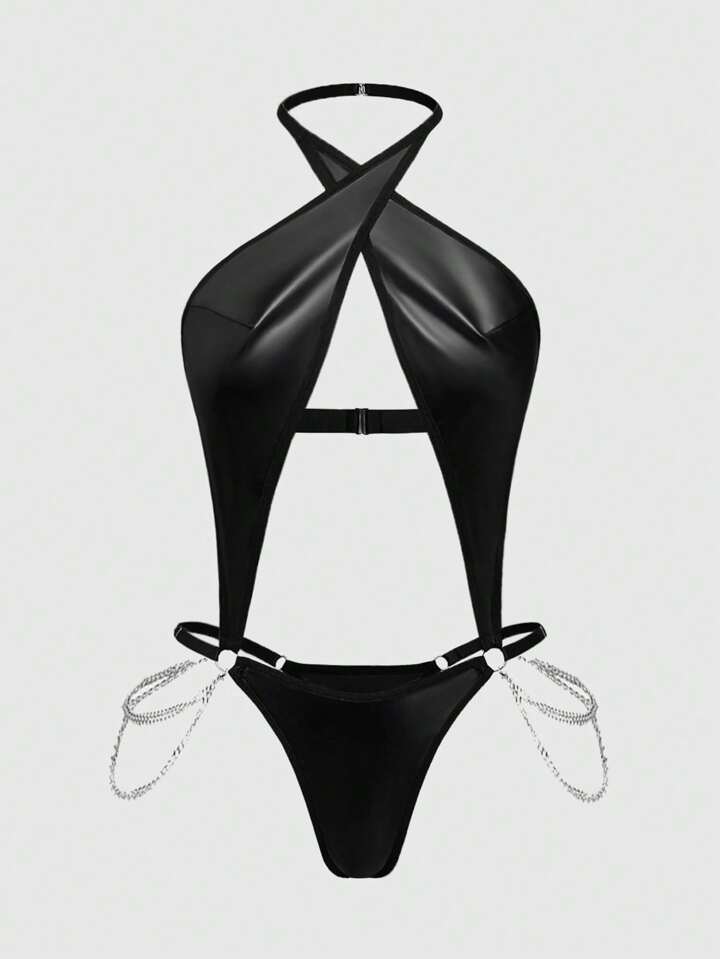 Grunge Punk Plus Size Dark Punk PU Leather Suspender Thong Bodystocking With Chain Details