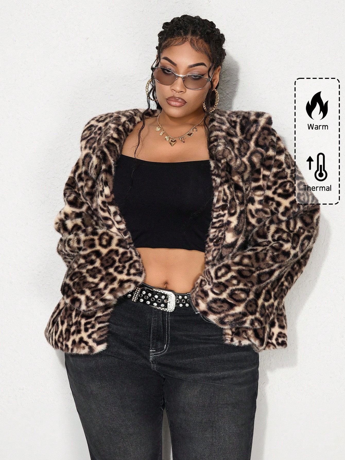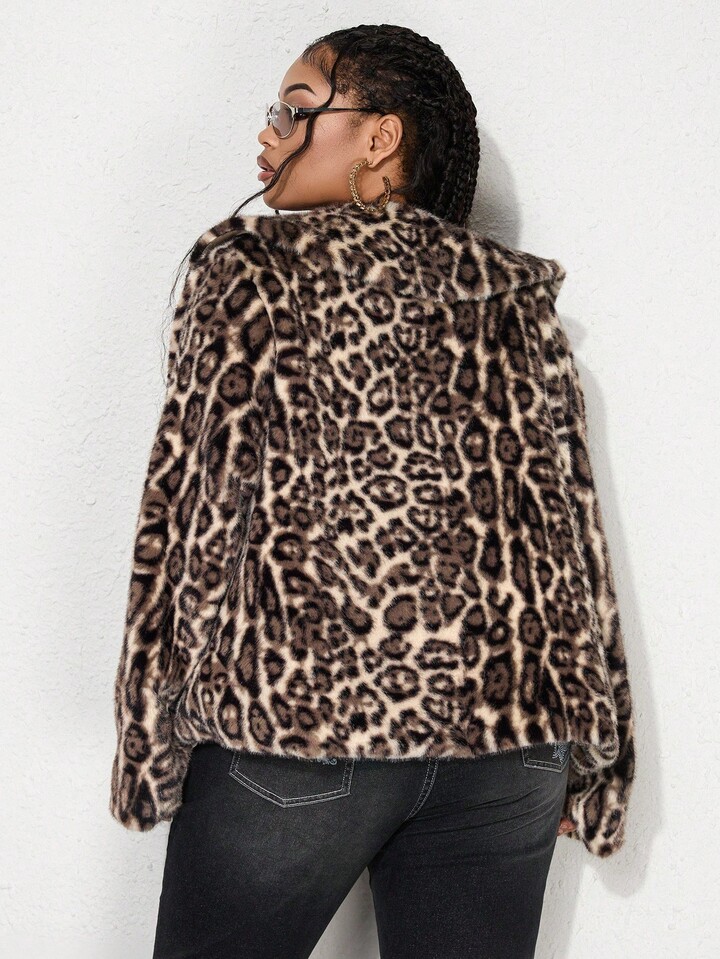 Grunge Punk Plus Size Leopard Print Open Front Faux Fur Long Sleeve Jacket