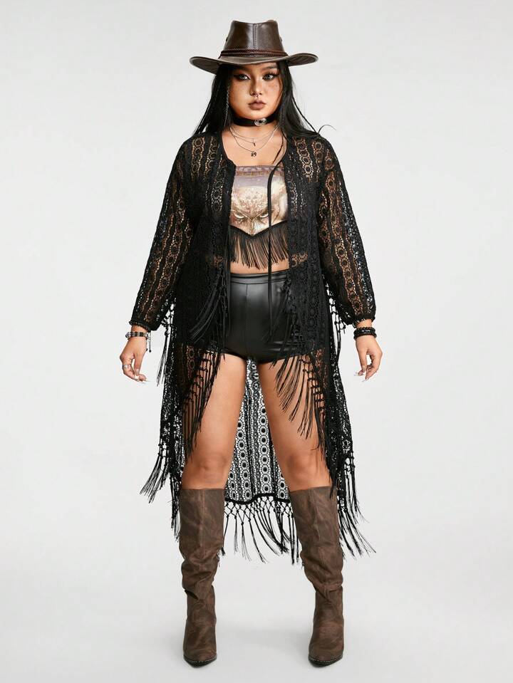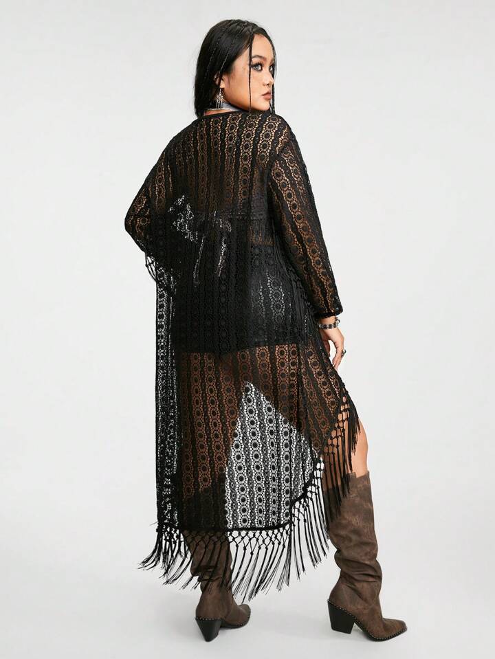 Grunge Punk Plus Size Sexy Casual Loose Fit Black Cardigan With Western Hollow Out Lace Mesh And Tassel Trims
