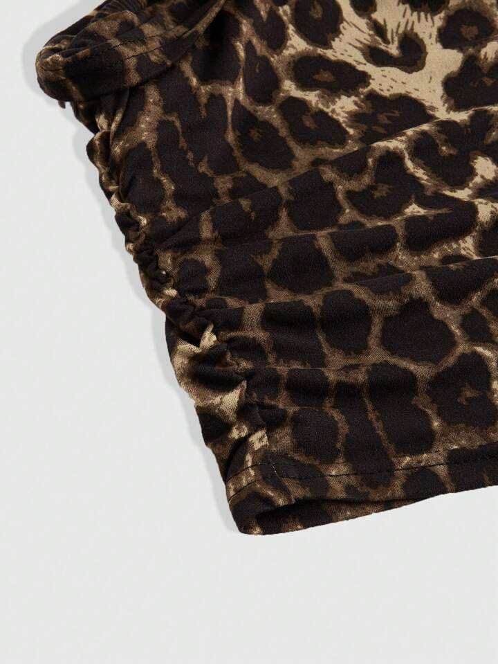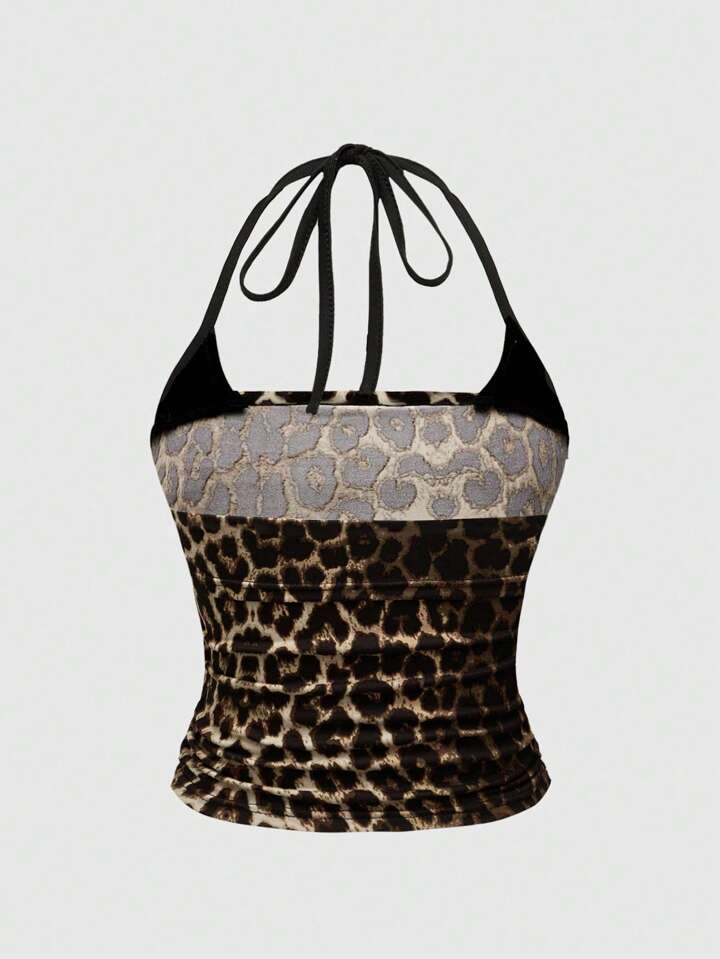 Grunge Punk Plus Size Spring Concert Festival Leopard Print Vintage 2 In 1 With Spaghetti Strap Tie-Up Bow Detail, Sexy Halter Crop Top