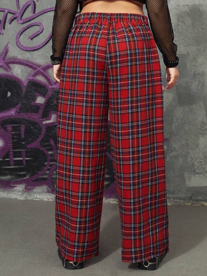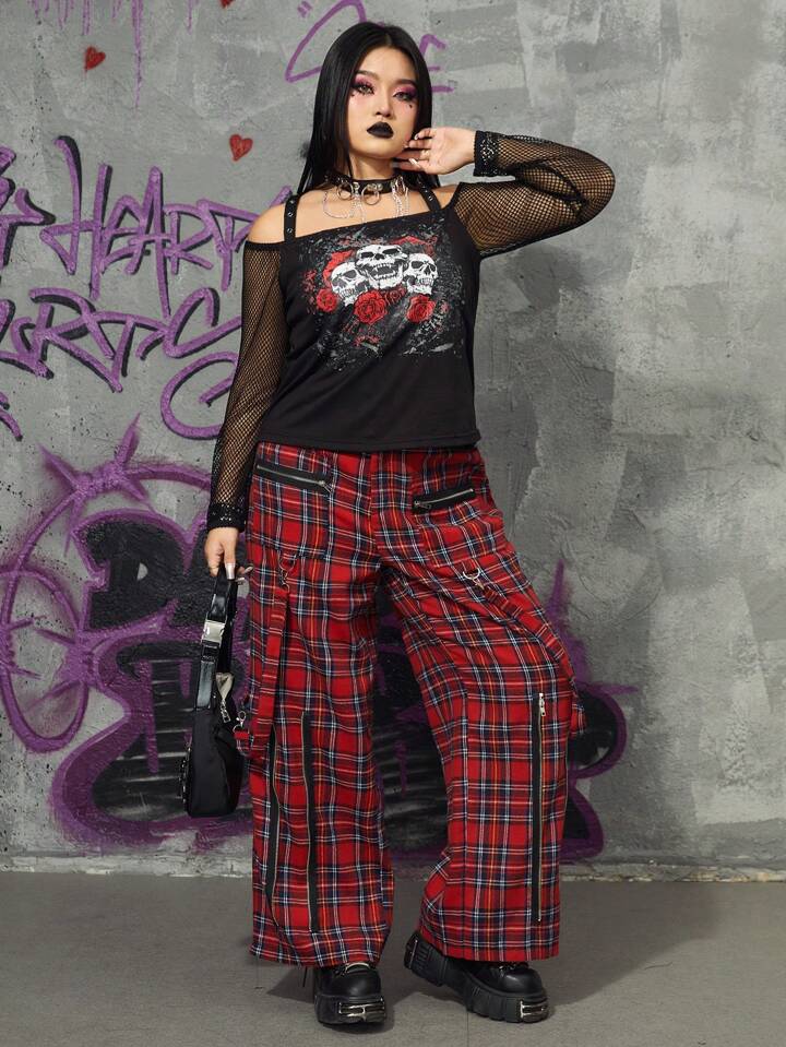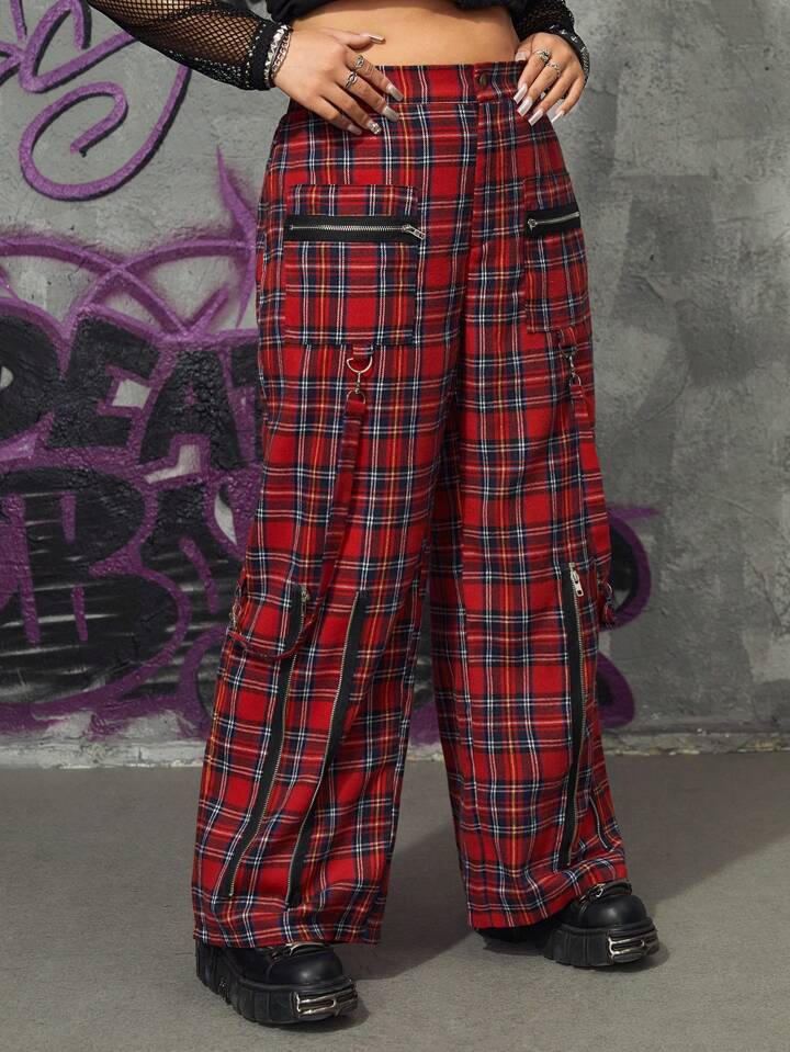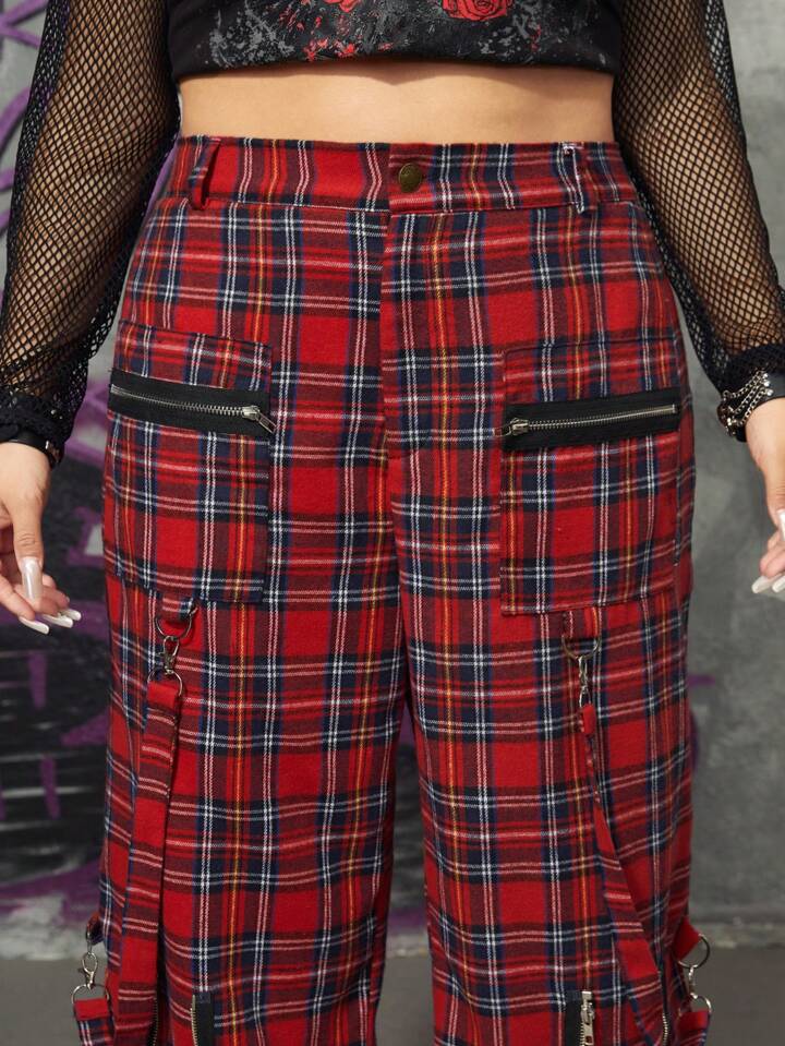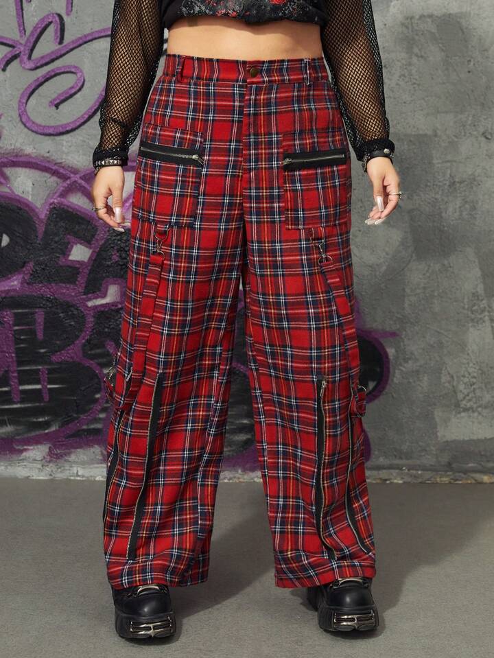 Grunge Punk Plus Size Straight Leg Plaid Pants With Chain Decoration, Zipper Pockets