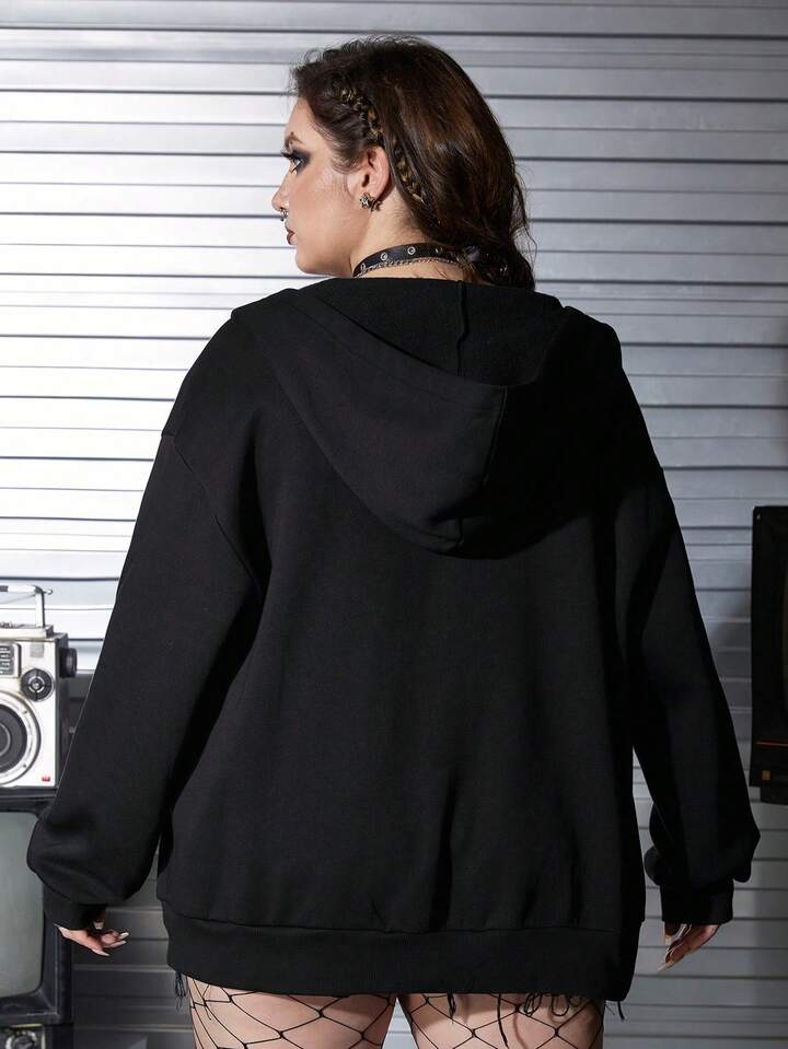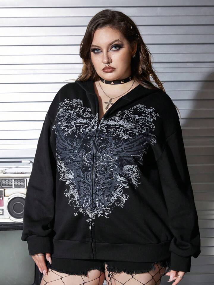 Grunge Punk Plus Size Women Casual Hooded Zip Up Hoodie With Skull Rose Wings And Vine Pattern