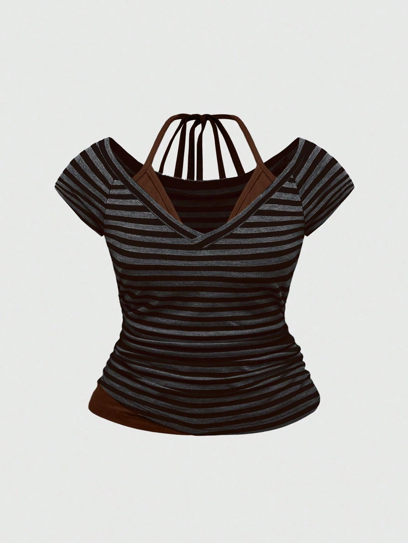Grunge Punk Plus Size Women Y2K Sexy Strappy Tie Back V-Neck Two Pieces Color Block T-Shirt, Summer