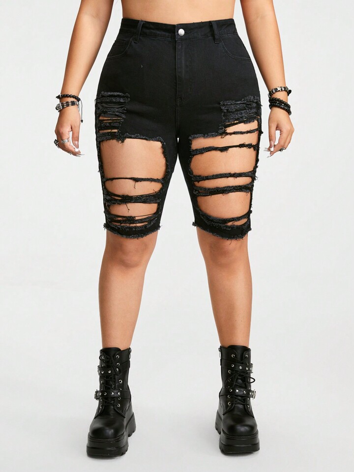 Grunge Punk Plus Size Women's Fashionable Ripped Denim Shorts