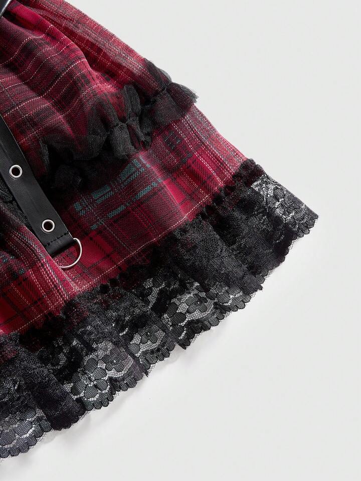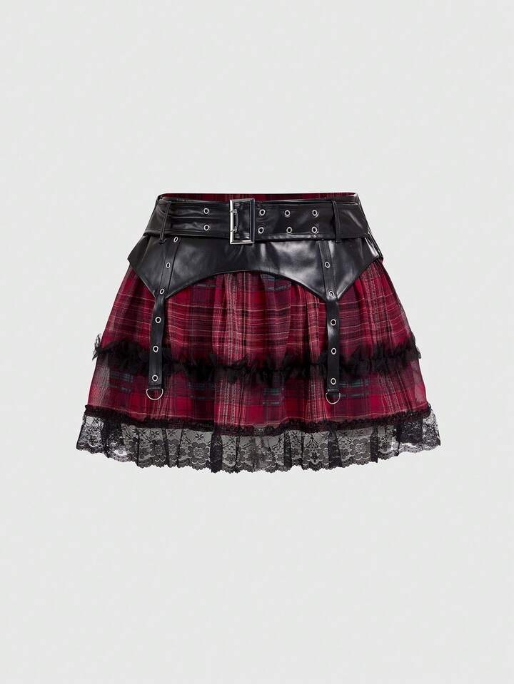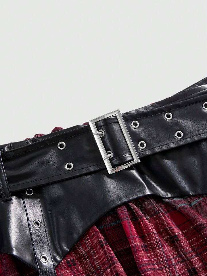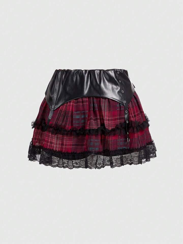 Grunge Punk Plus Size Y2K Punk Plaid PU Patchwork Mini Flared Skirt