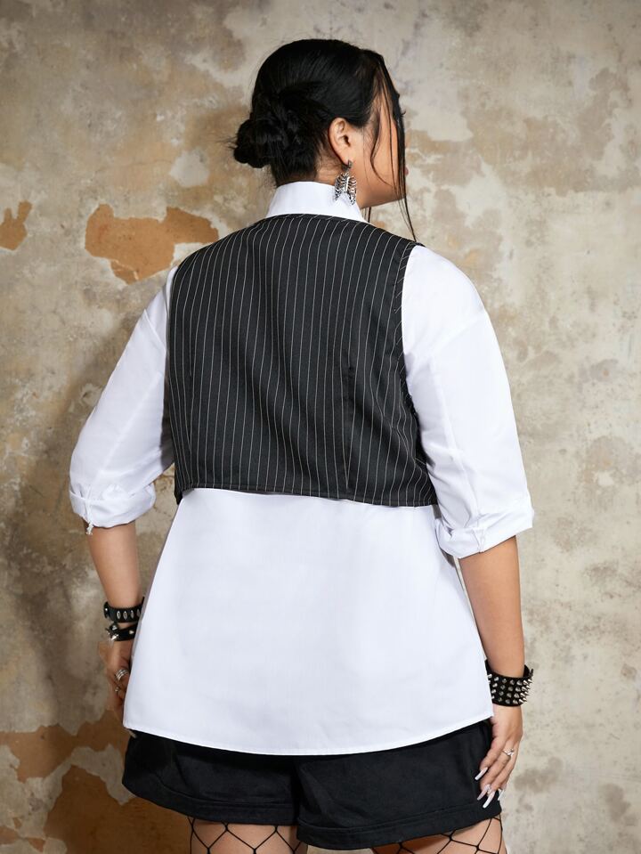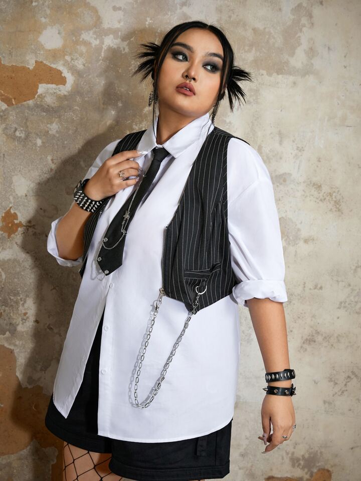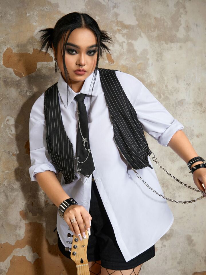 Grunge Punk Plus Striped Print Vest Jacket Without Shirt