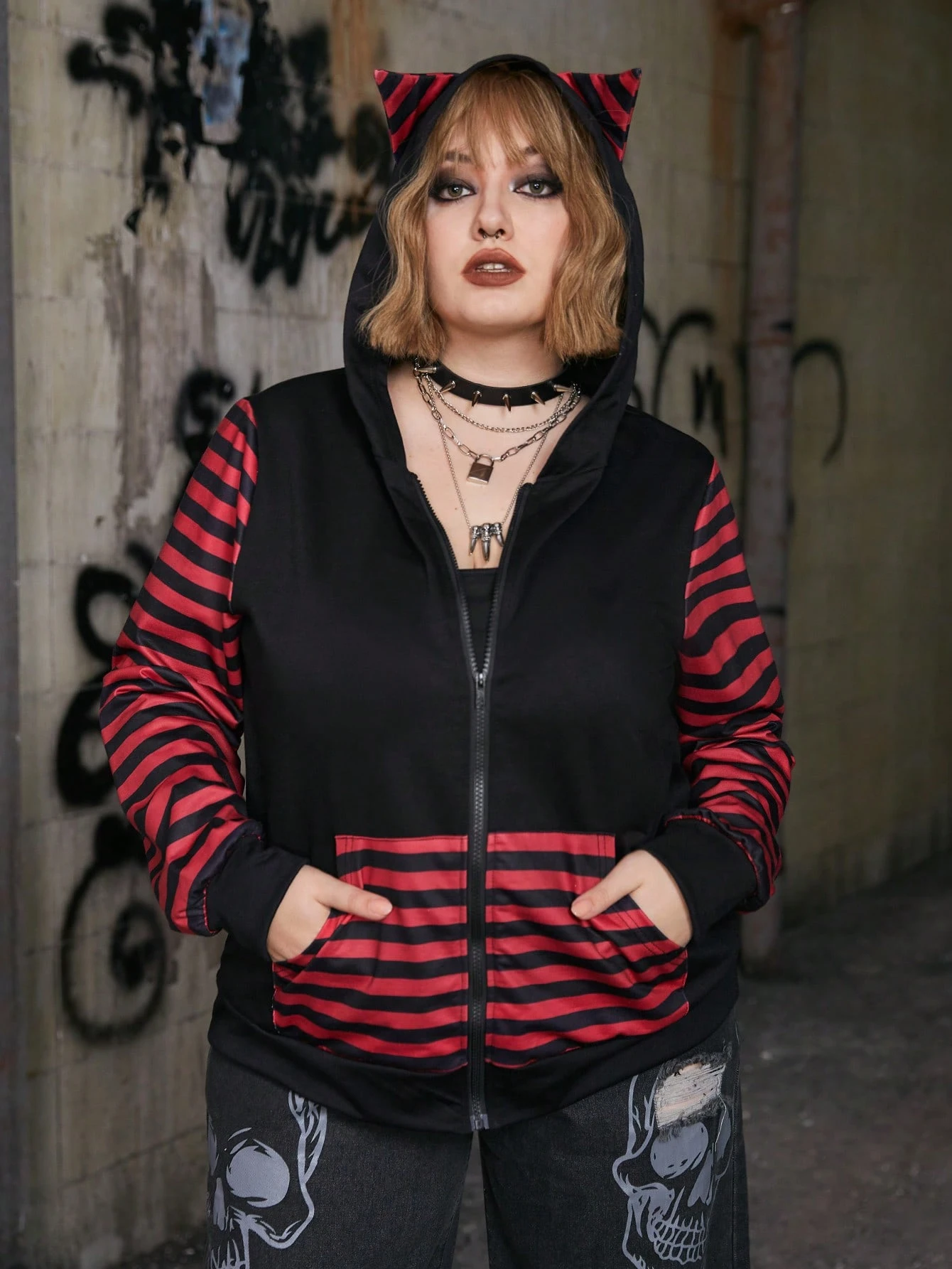 Grunge Punk Plus Striped Print Zip Up Hoodie
