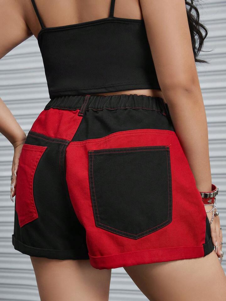 Grunge Punk Plus Two Tone Roll Hem Denim Shorts