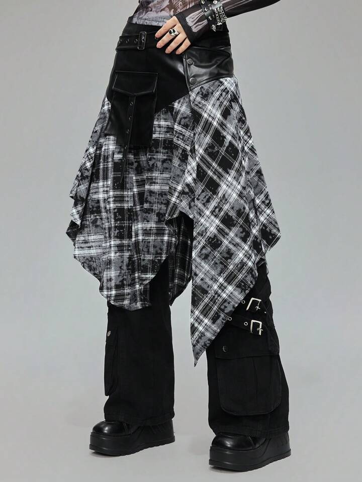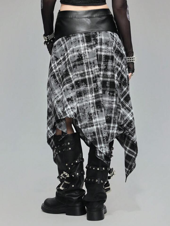 Grunge Punk Punk Red And Black Plaid Patchwork PU Asymmetrical Hem Skirt