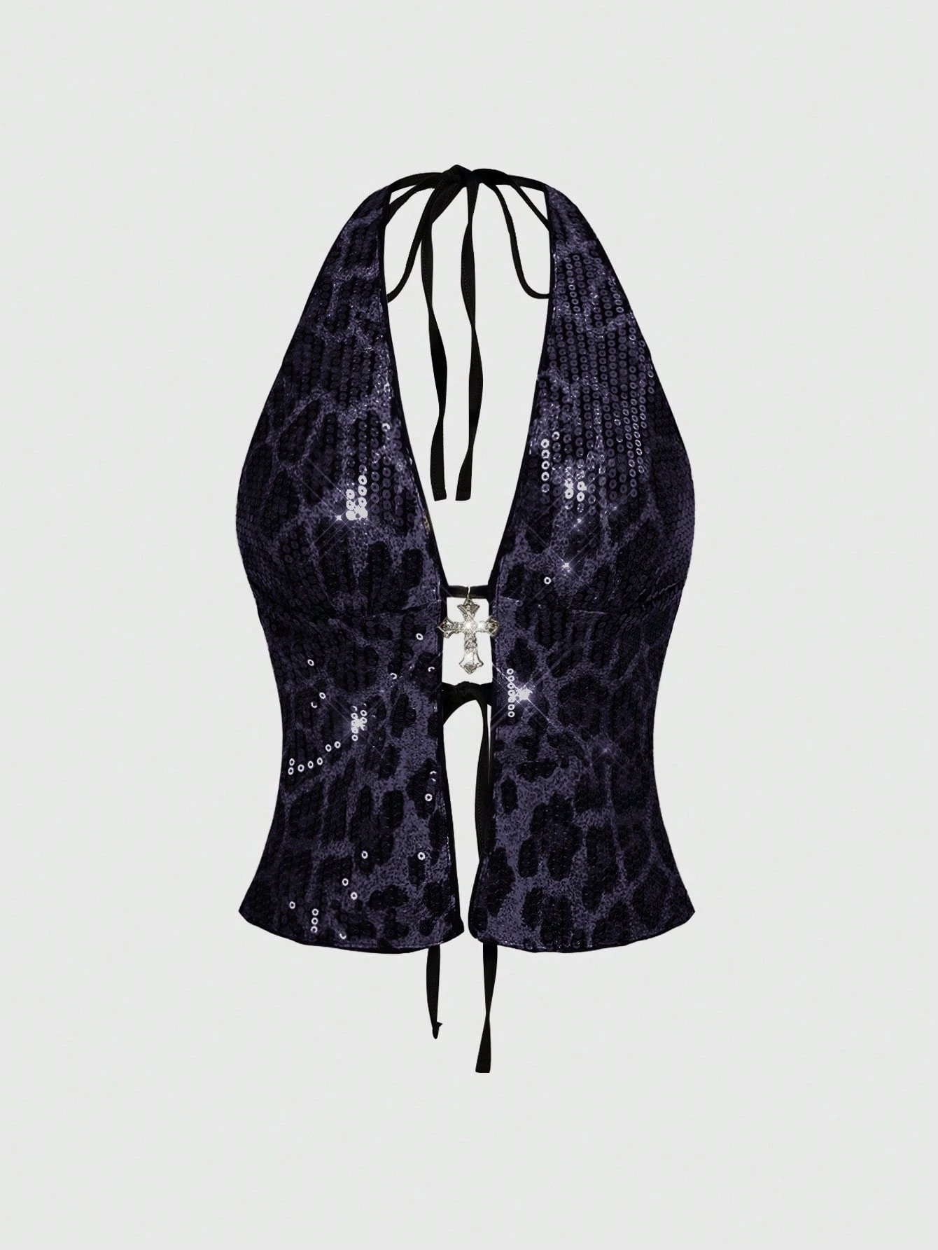 Grunge Punk Punk Rock Chic Summer Beach Party Outfit, Festival, Street Fashion, Y2K Halter Sexy Leopard Print Sequin Cross Pendant Women Tank Top