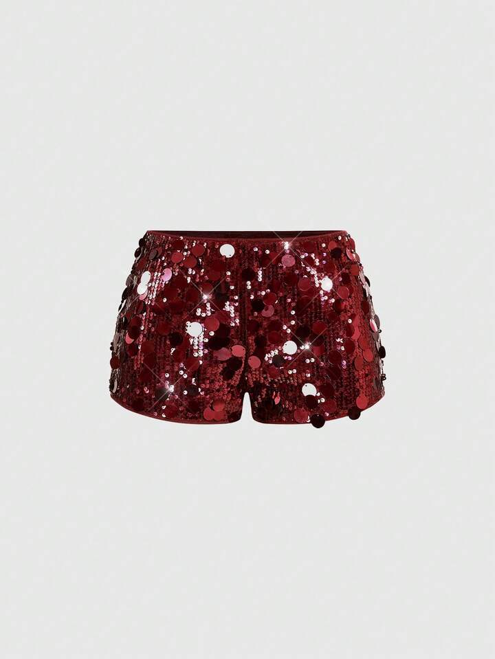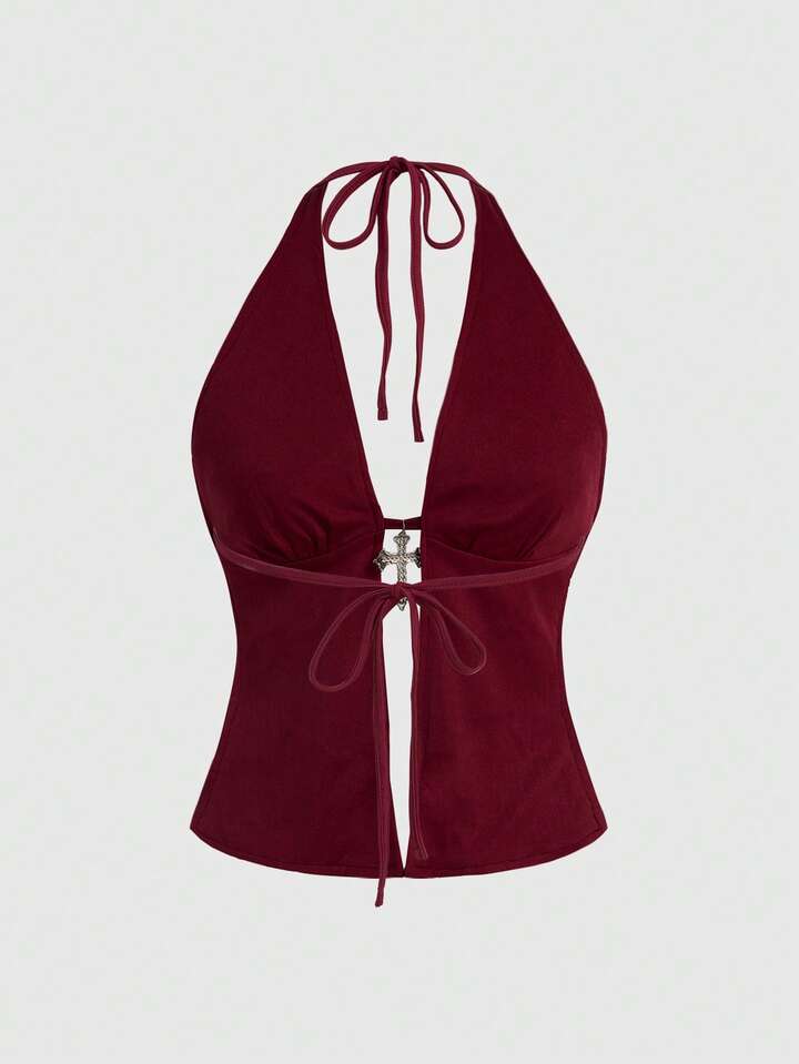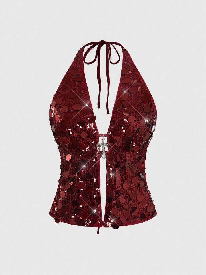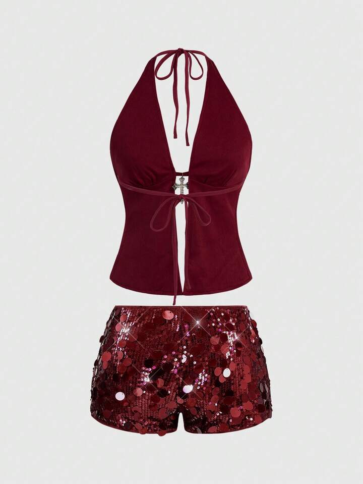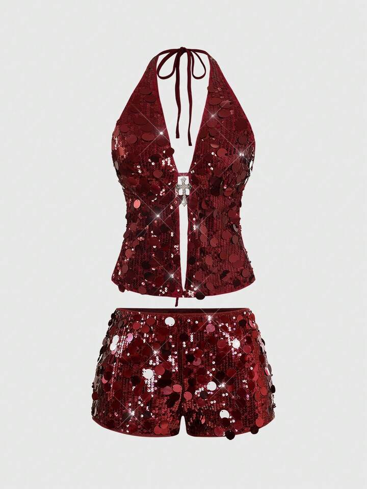Grunge Punk Punk Rock Diva Party Outfit, Festival Music Event New Year Costume, Halter Neck Sexy Sequin Cross Pendant 2 Pieces Set For Women
