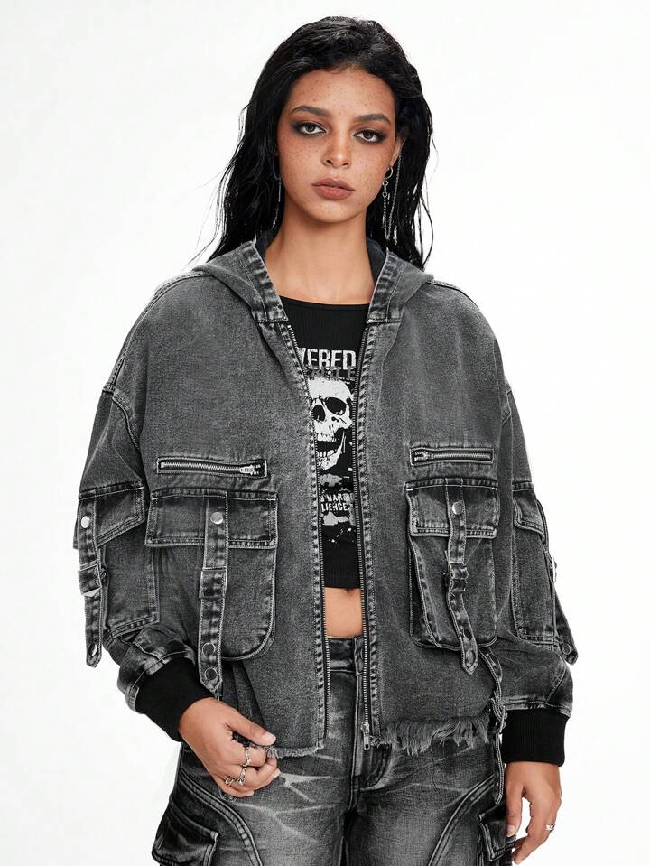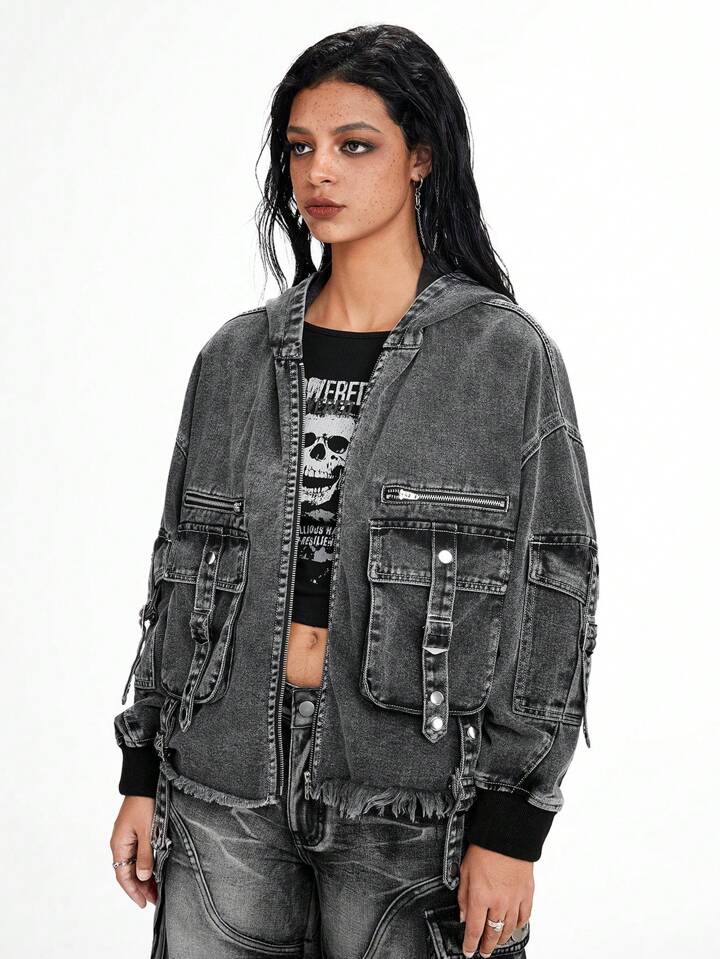 Grunge Punk Punk Rock Style 3D Pockets Embellished Loose Denim Jacket For Women