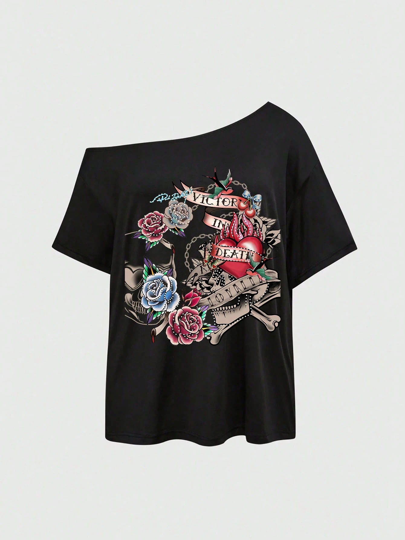Grunge Punk Punk Sexy Asymmetrical Shoulder Black Skull Flag & Rose Graphic Vintage Plus Size Summer Tee, Plus Size