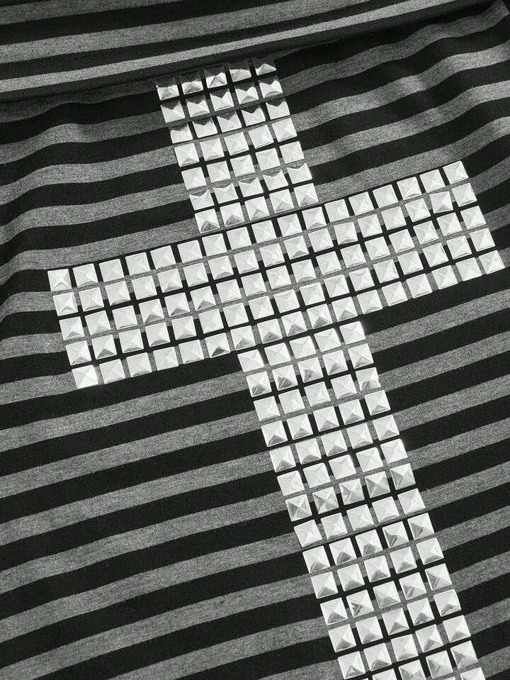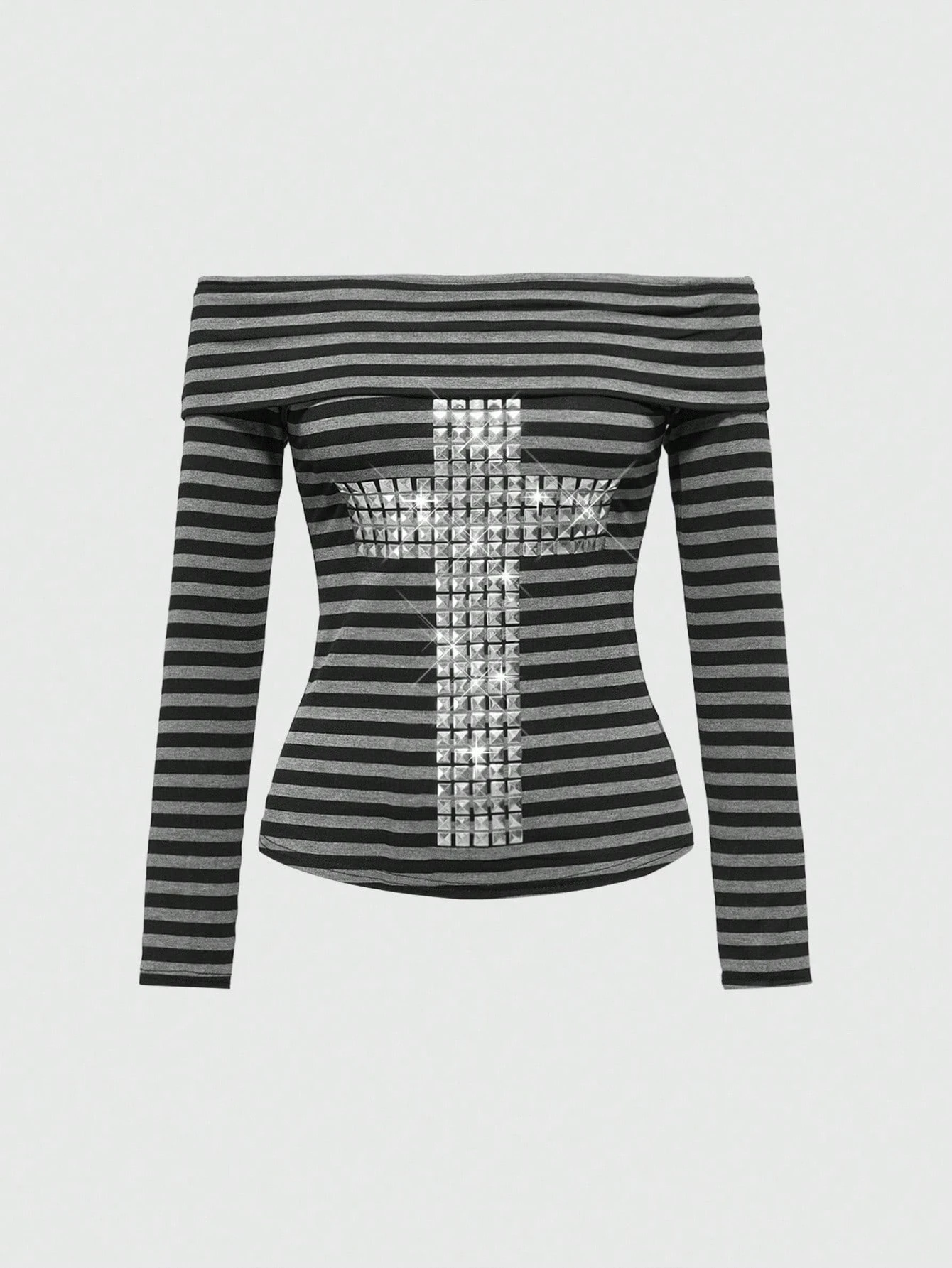 Grunge Punk Punk Sexy Y2K Kpop Striped Rivet Cross Off Shoulder Fitted Long Sleeve T-Shirt For Women