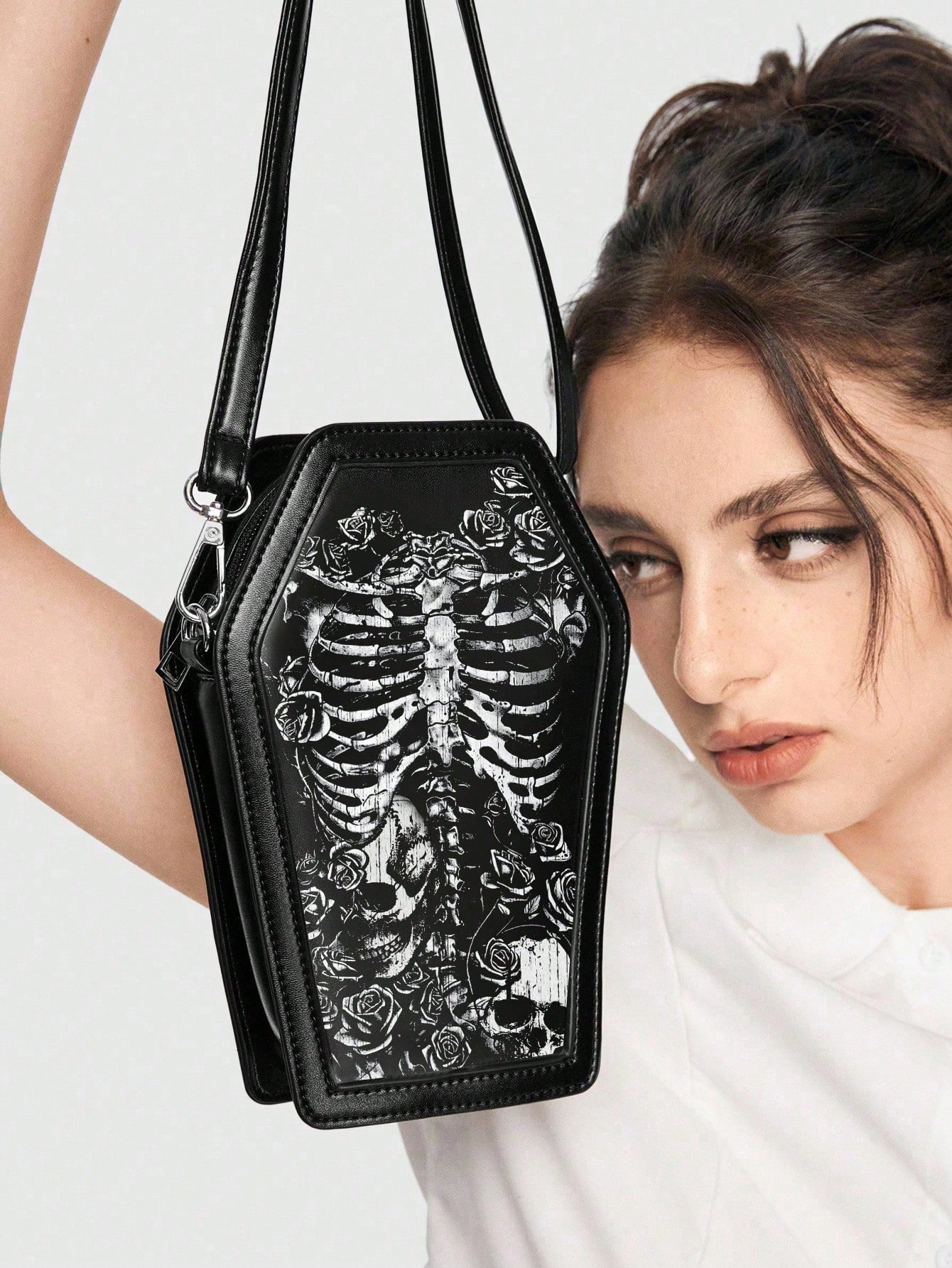 Grunge Punk Punk Skull Rose Casket Shoulder Bag Gothic Y2K Party Travel Crossbody Bag, Halloween