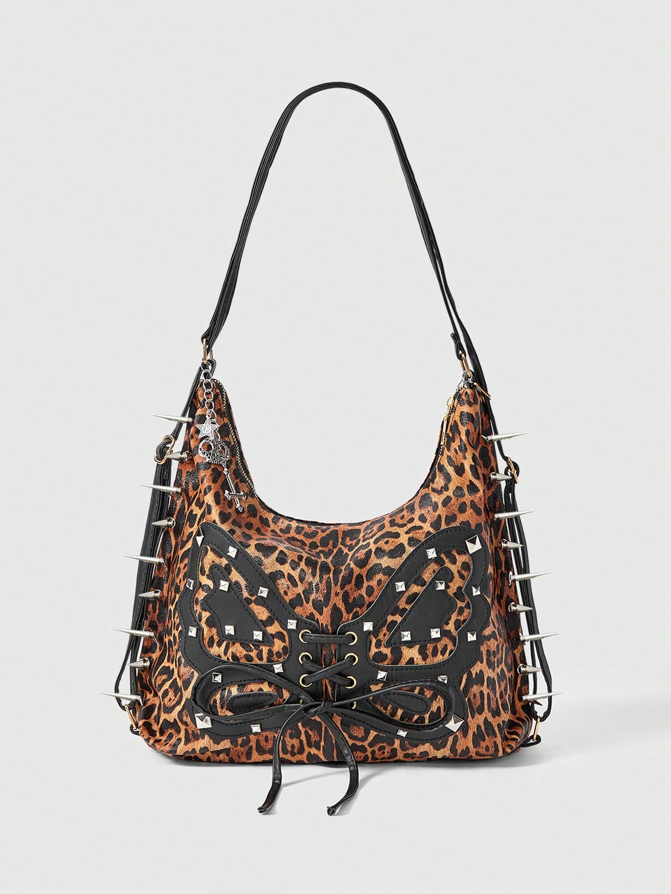 Grunge Punk Punk Style Leopard Print & Butterfly Patchwork Design, Rivet & Spike Decor, Chain Pendant Accent, Edgy & Sweet Girls' Personalized Handbag