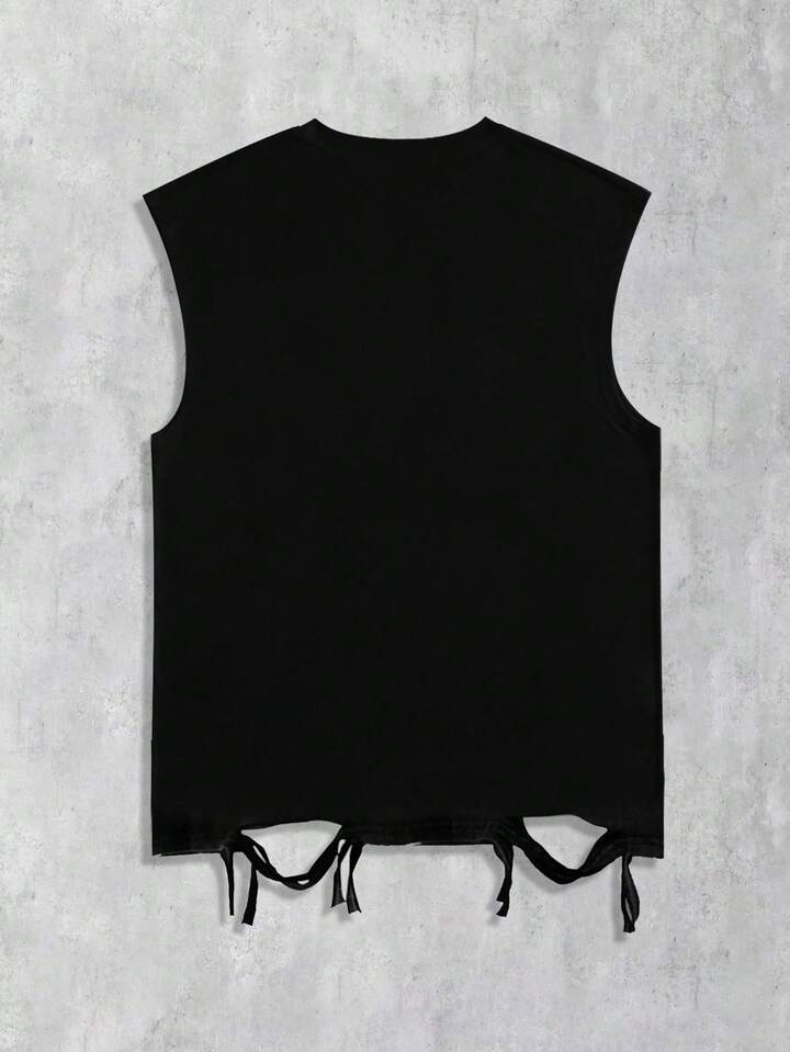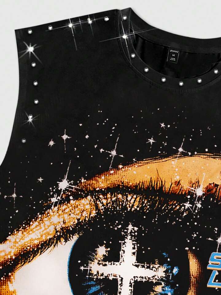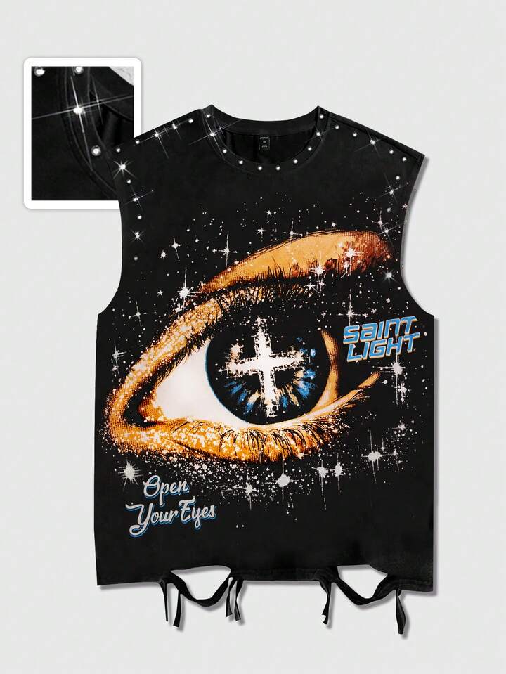 Grunge Punk Punk Style Street Graphic Print Sleeveless Crew Neck Tank Top With Rhinestones And Distressed Details, Men Summer