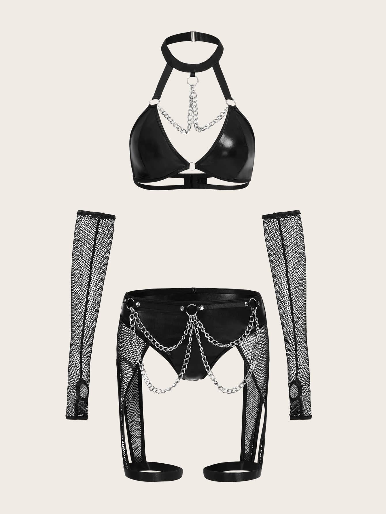 Grunge Punk Punk Y2K Music Festival Chain PU Mesh Halter Triangle Bra, Triangle Panty, Garter Belt, Gloves Sexy Lingerie Set