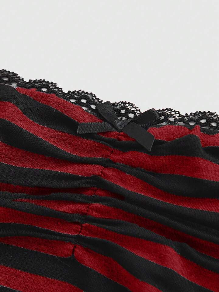 Grunge Punk Red Sexy Vacation Lace Trim Leopard Print Bowknot Ruched Elastic Fitted Ladies Top