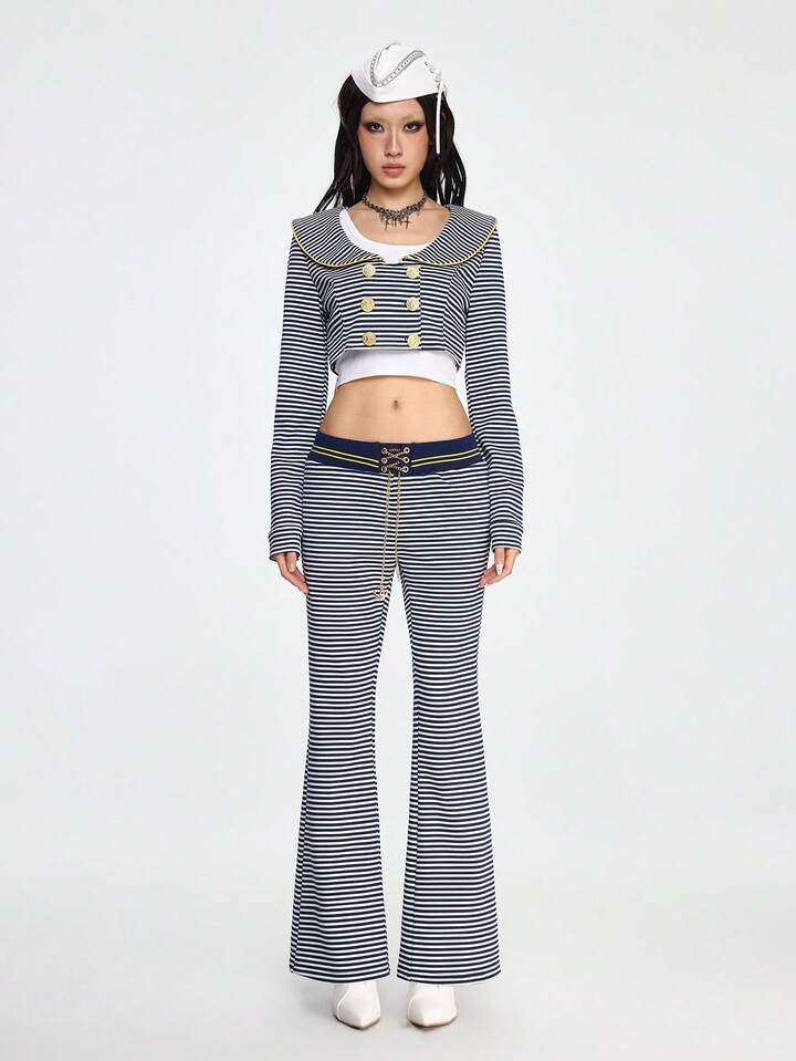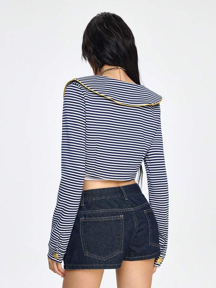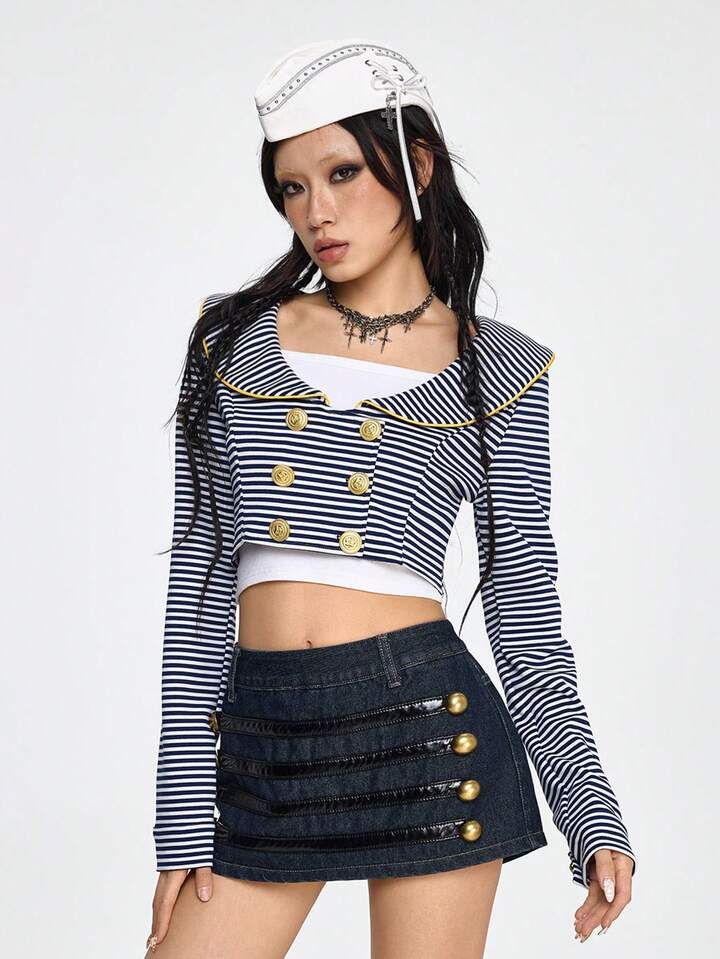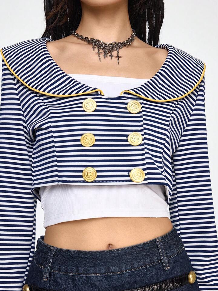 Grunge Punk Retro Nautical Navy Blue & White Striped Open Front Short Lightweight Jacket