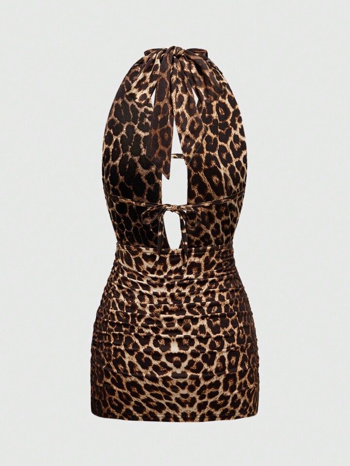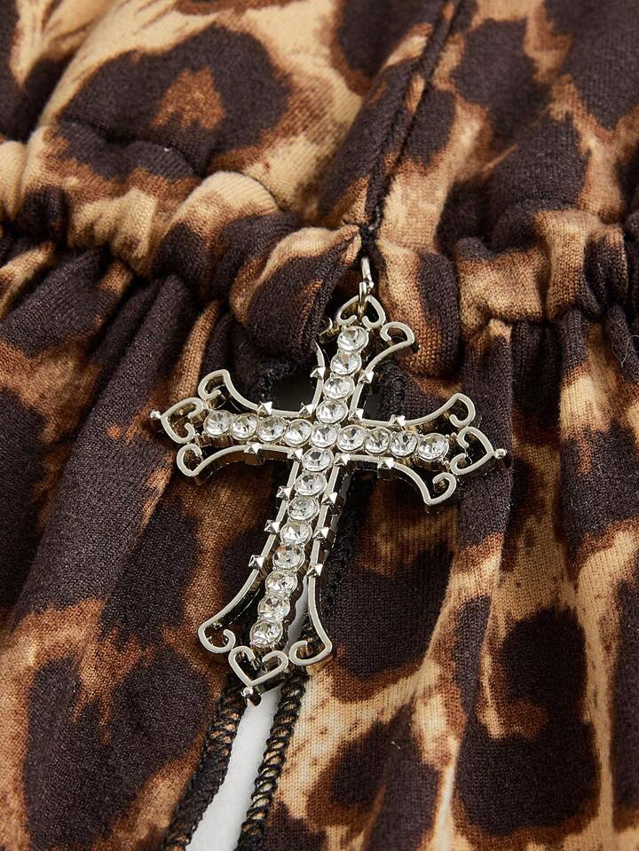 Grunge Punk Sexy Leopard Print Cross Pendant Draped Neck Backless Mini Dress