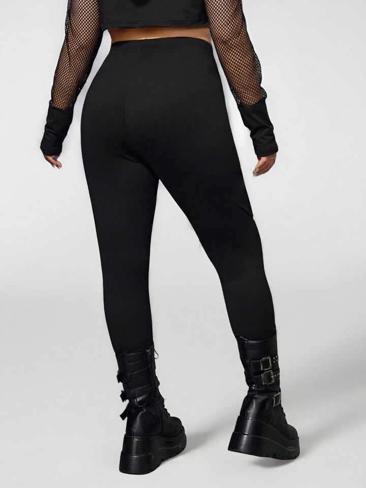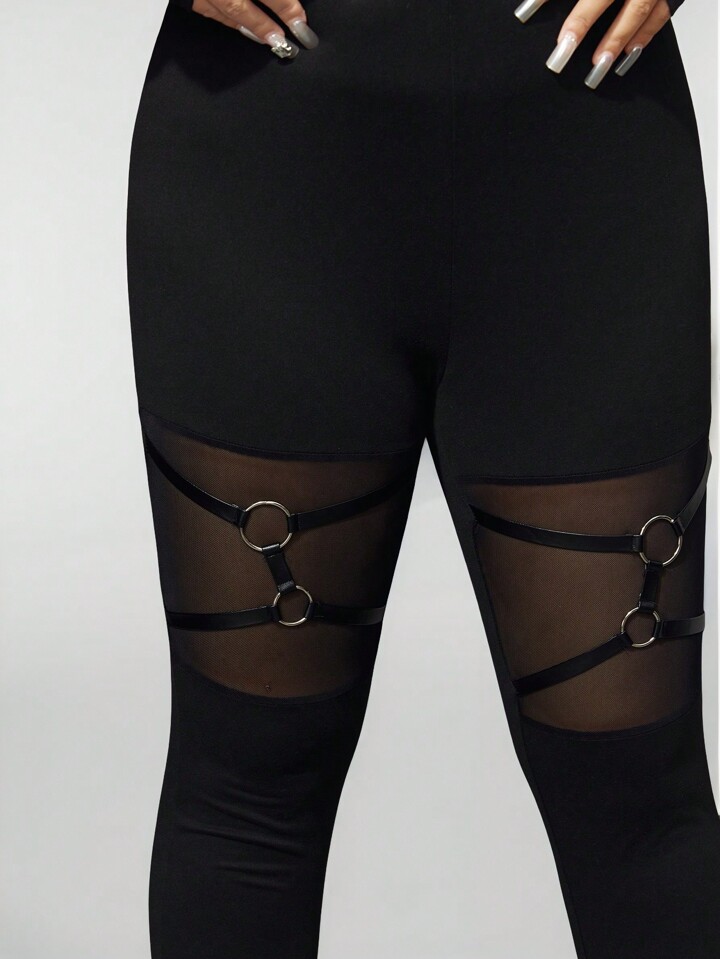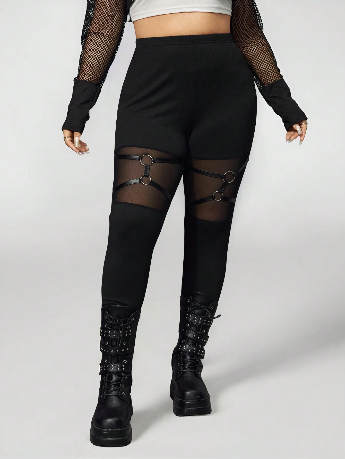 Grunge Punk Sexy Plus Size Leggings With Hollow Out Belt Decorated Buckle Design, Gothic Punk Style, School