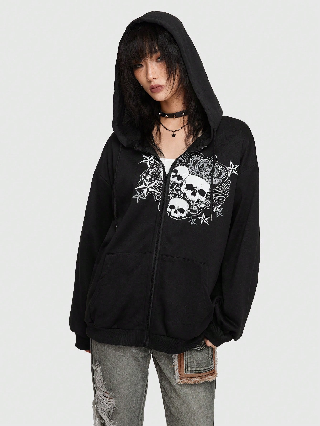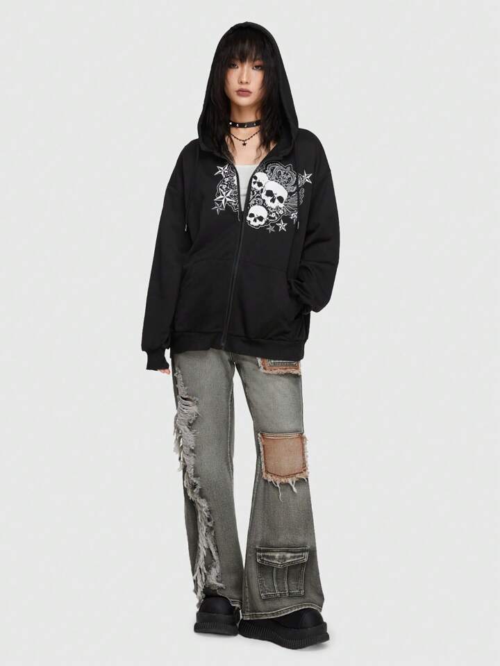 Grunge Punk Skull & Star Graphic Zip Up Hoodie