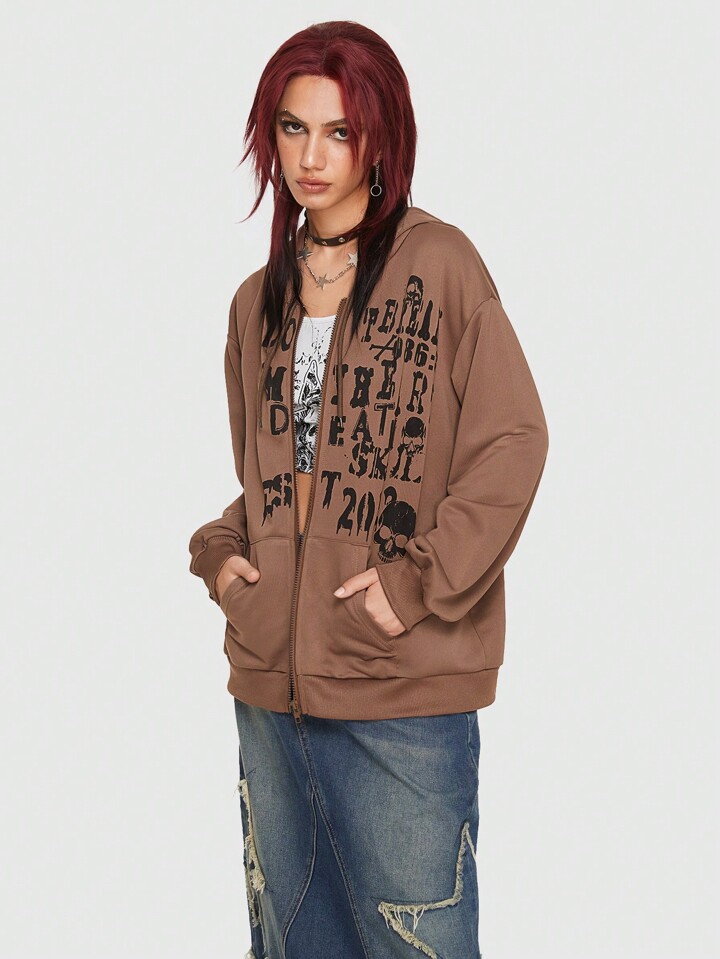 Grunge Punk Slogan Graphic Drop Shoulder Zip Up Hoodie