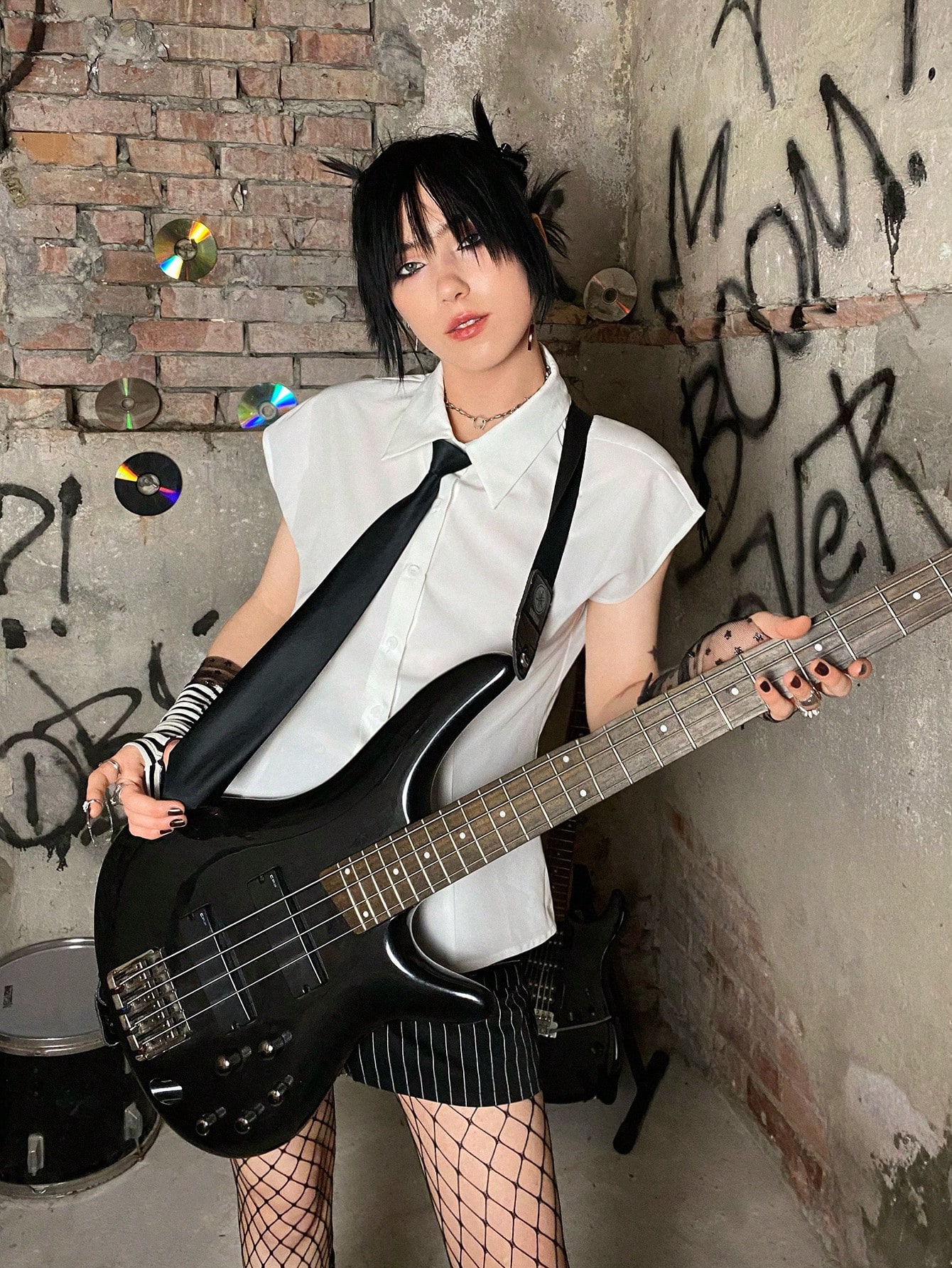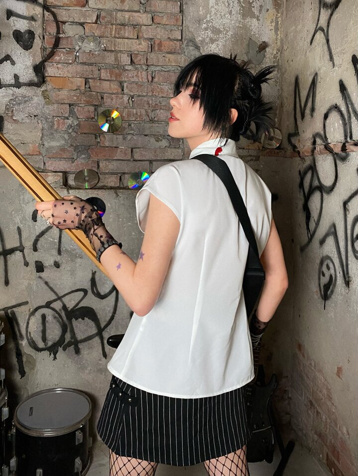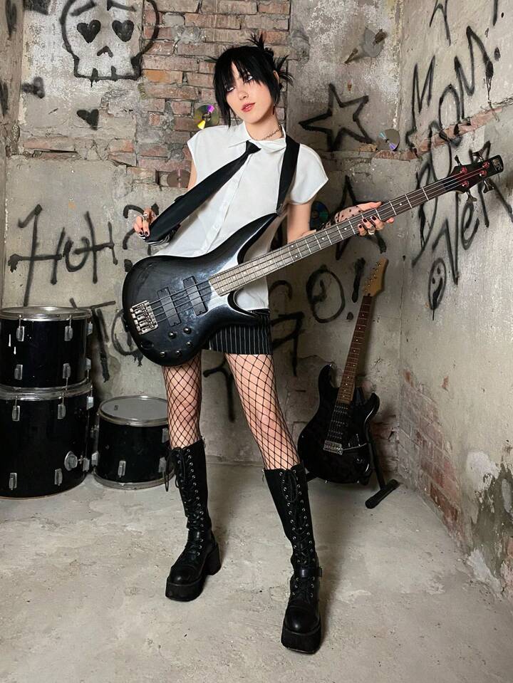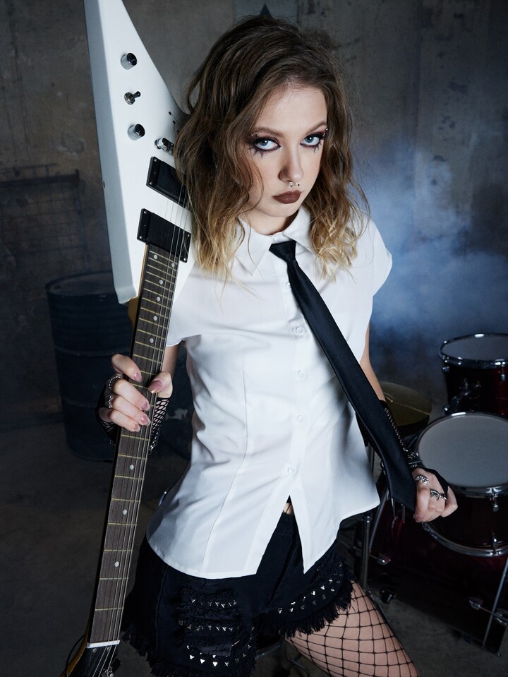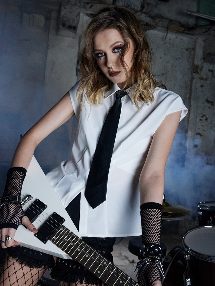 Grunge Punk Solid Batwing Sleeve Shirt With Tie