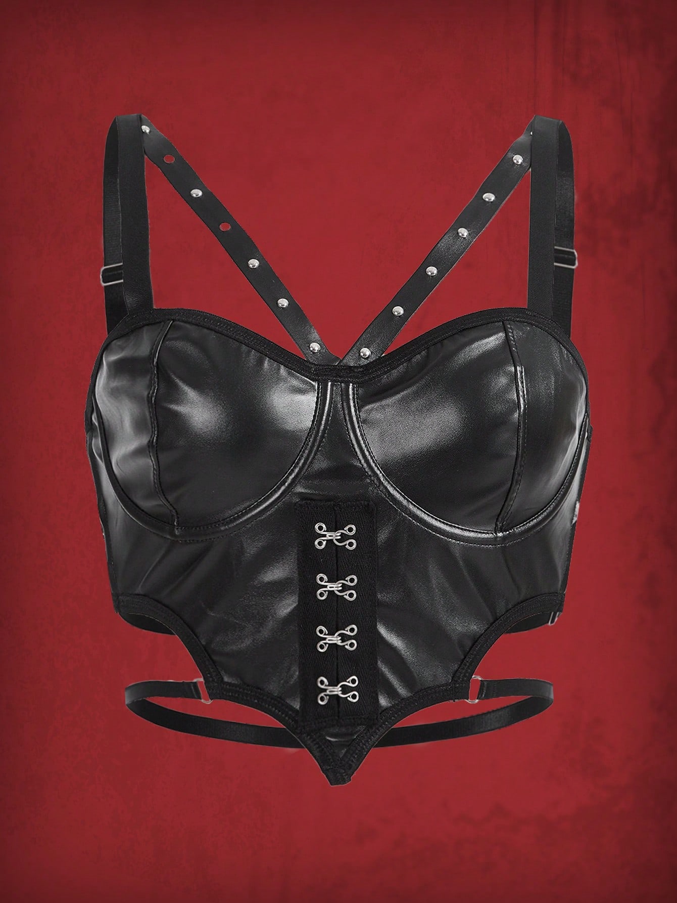 Grunge Punk Solid PU Leather Hook And Eye Cut Out Bra