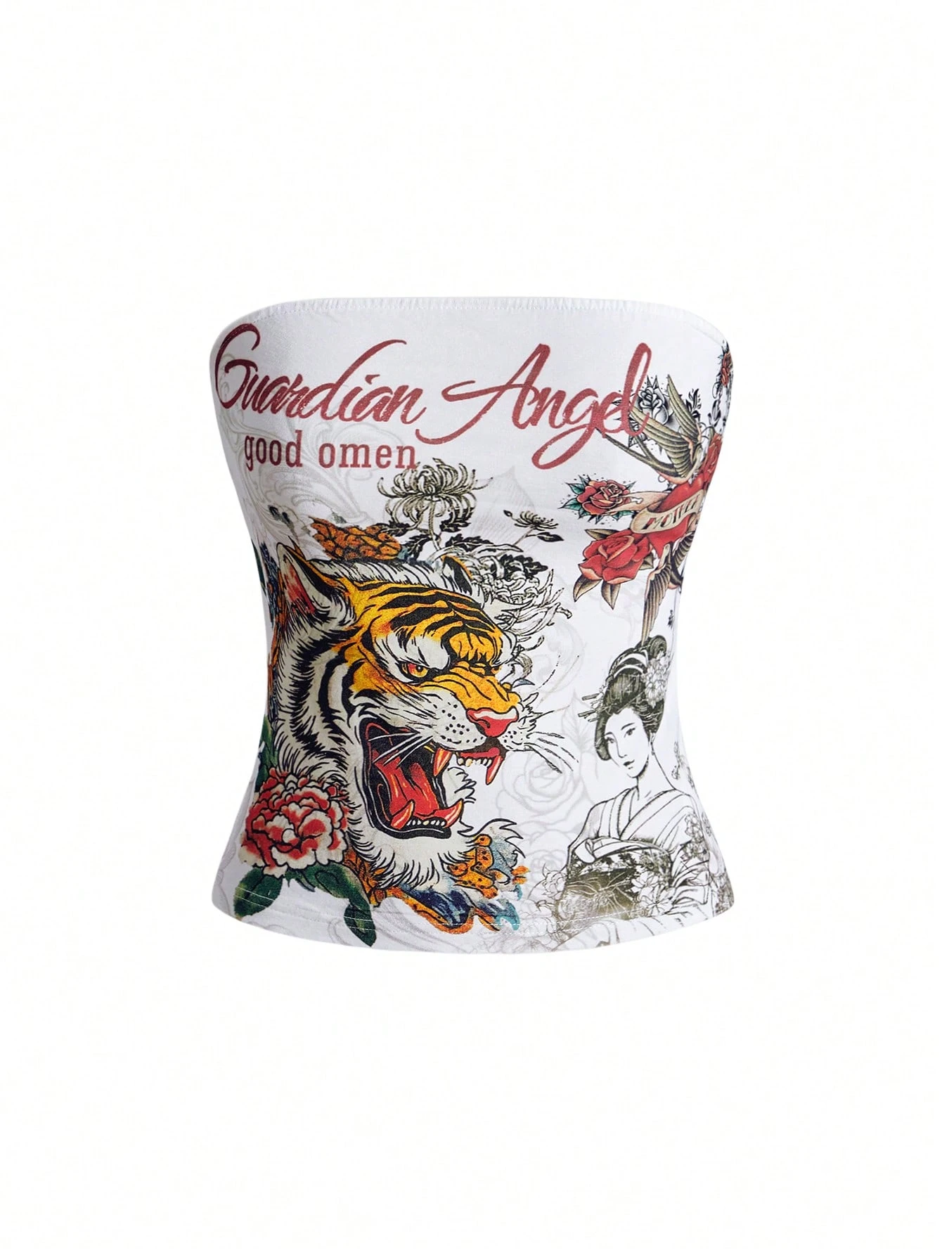 Grunge Punk Spring/Summer Casual Graphic White Y2K Retro Tiger Vine Faux Tattoo Print Tight Crop Top