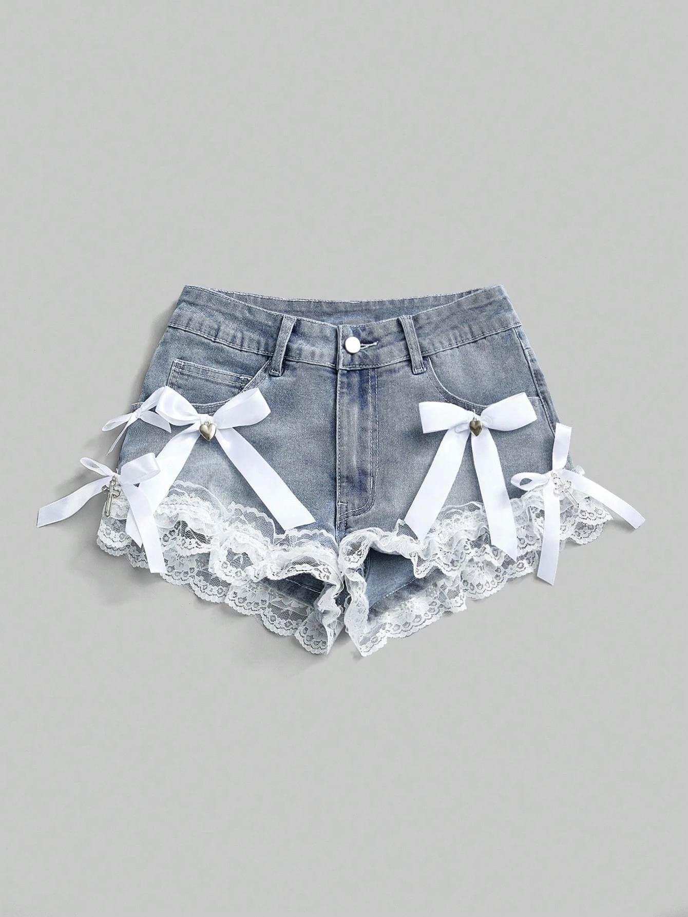 Grunge Punk Spring/Summer Valentine's Day Sexy Low-Waisted Cross Pendant Lace Bow Cute Streetwear Dark Blue/Black Mini Super Low Waist Denim Shorts, Suitable For Summer Beach, Graduation, Easter, Concert, Nashville Vacation