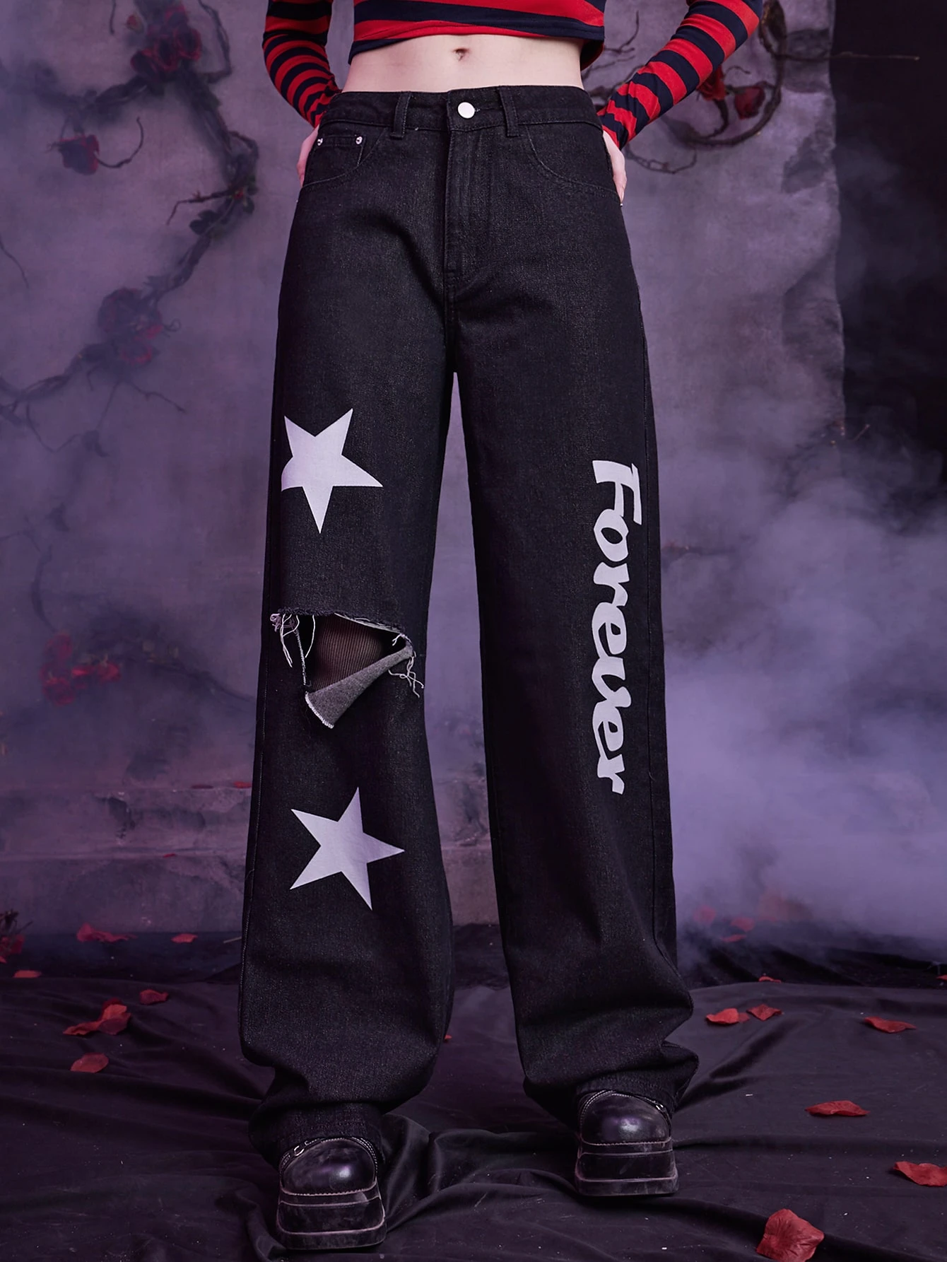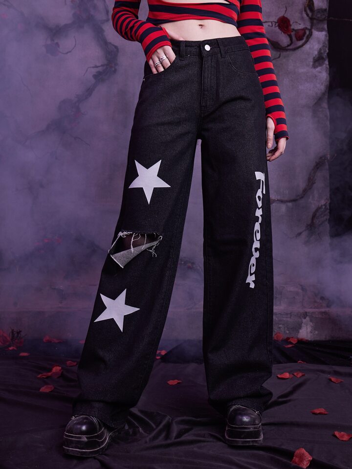 Grunge Punk Star & Letter Graphic Ripped Jeans