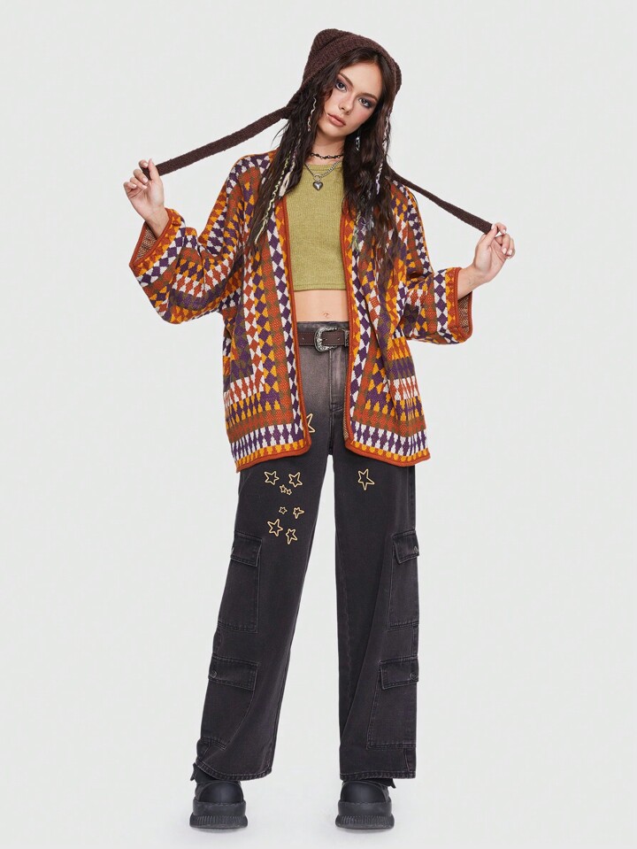 Grunge Punk Star Print Flap Pocket Cargo Jeans